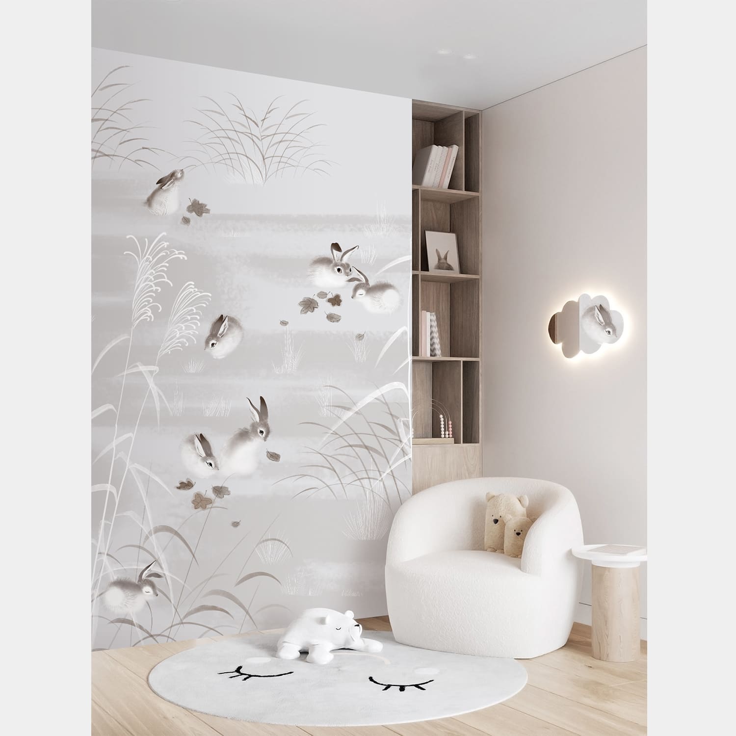 Дизайн с милыми кроликами Банни, играющими на поляне. Панно идеально подойдет для детской комнаты или игровой зоны. Такие обои каждый раз изготавливаются вручную по индивидуальному заказу.