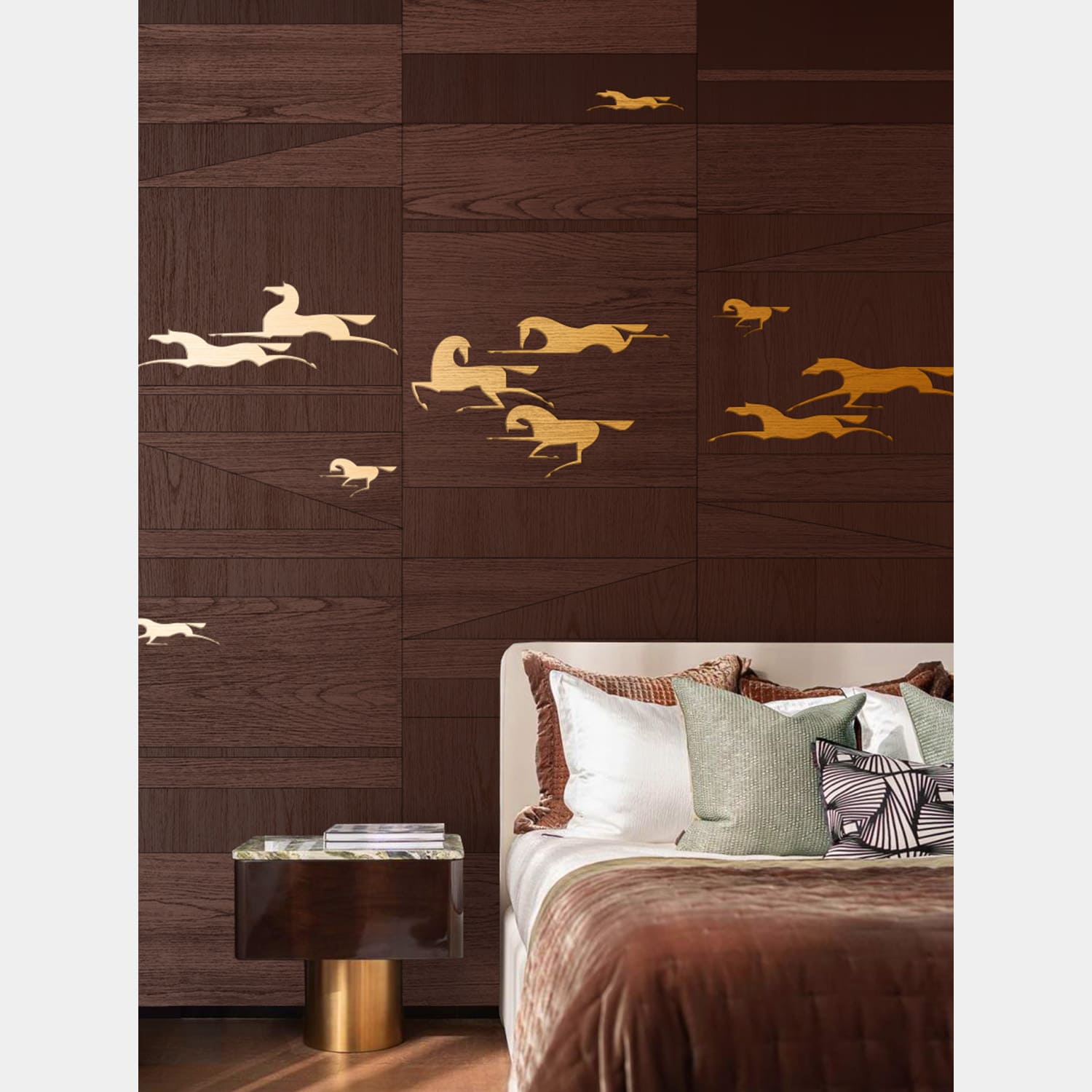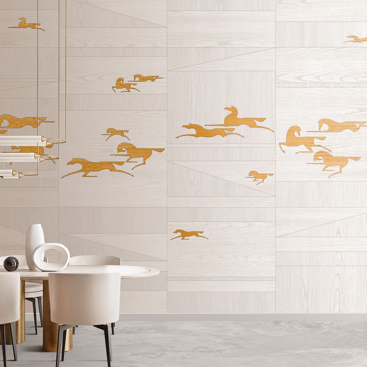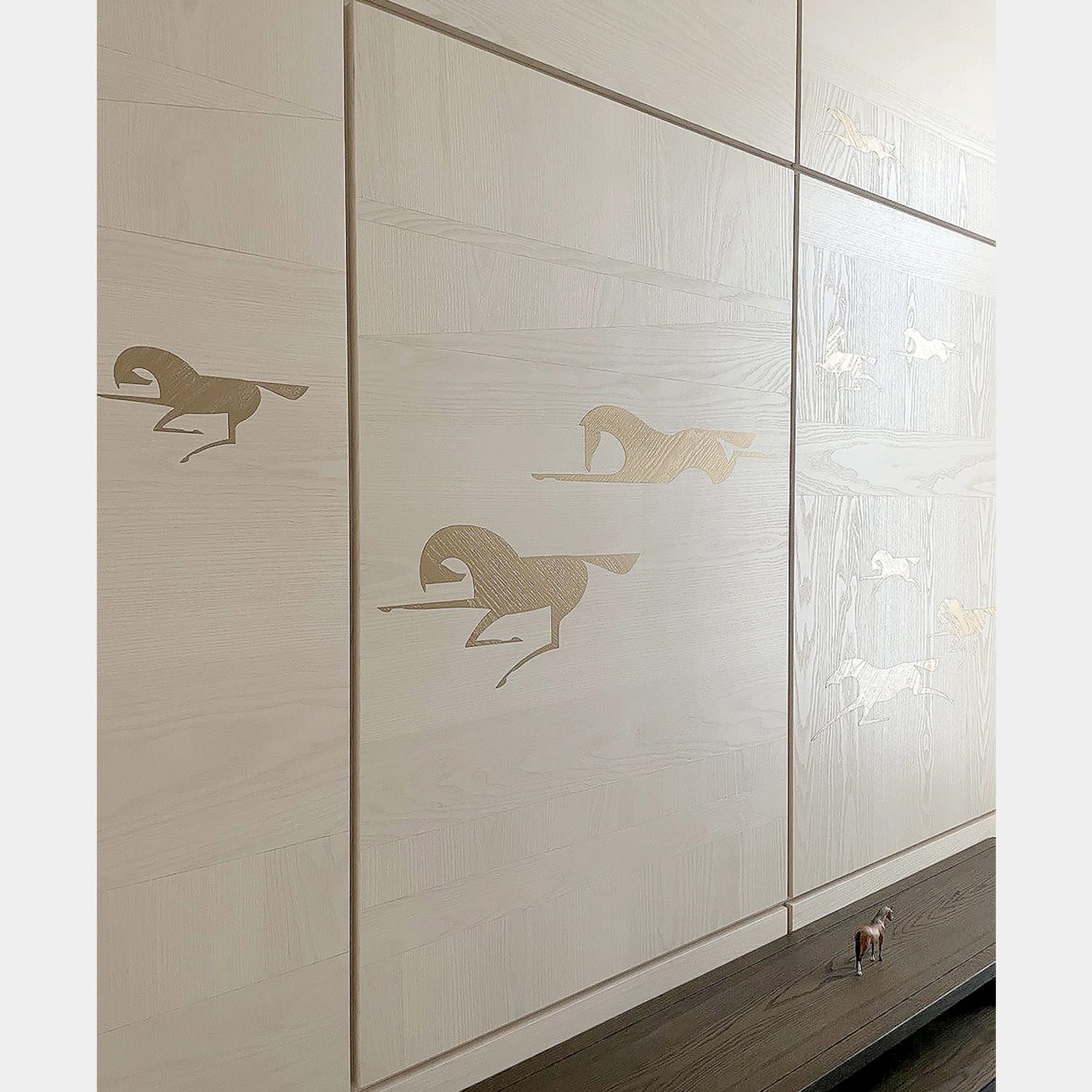 Стремительно летящие по степи легконогие лошади. Энергия ветра и бескрайние горизонты. Воздушная композиция из ритмических элементов расширит пространство стены в вашем интерьере. Особенность этой коллекции заключается в разном направлении шпона. Такой прием делает рисунок более объемным, переливающимся на свету. Это весьма трудоемкий процесс. Чтобы создать такой рисунок на одной панели, мастер тратит до 50 часов времени и несколько квадратных метров шпона.