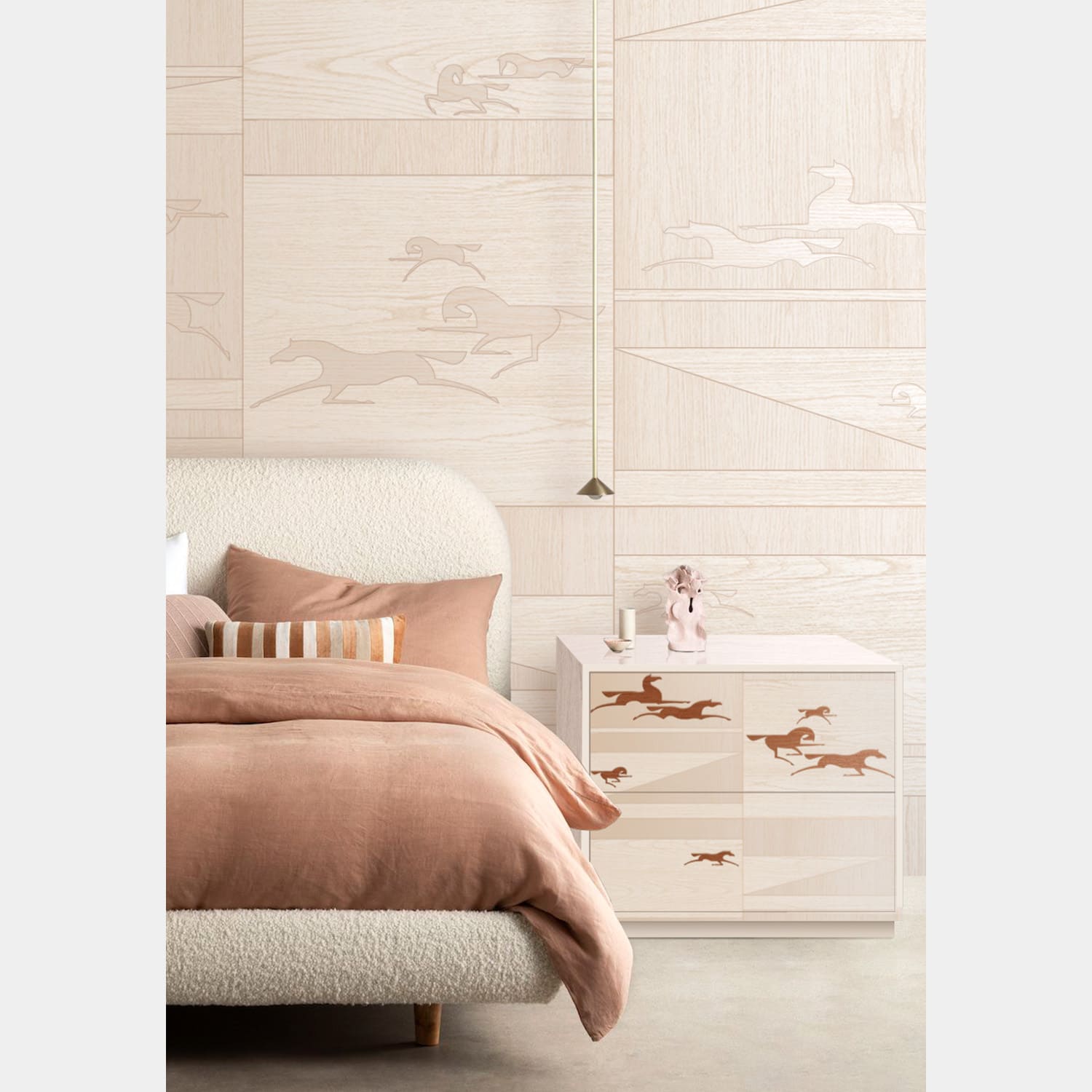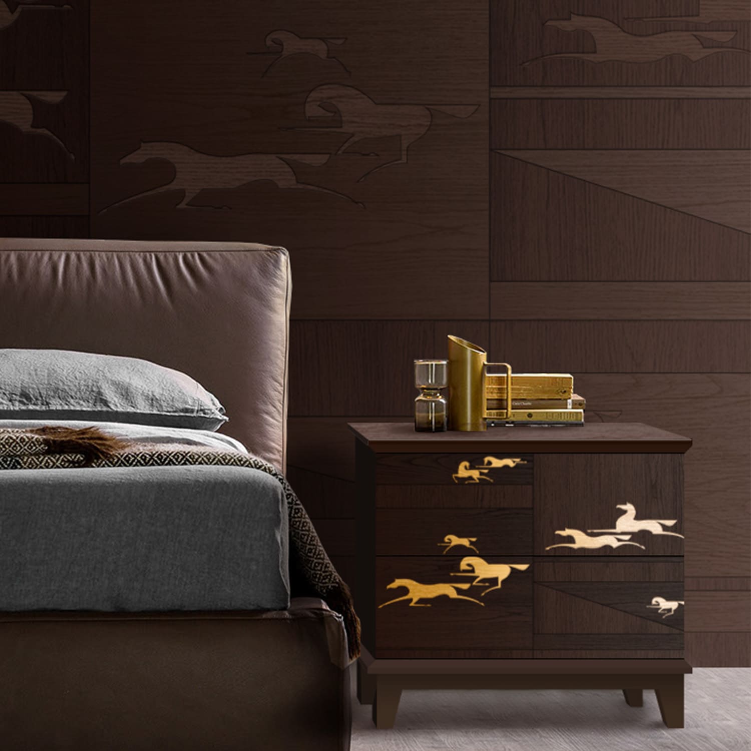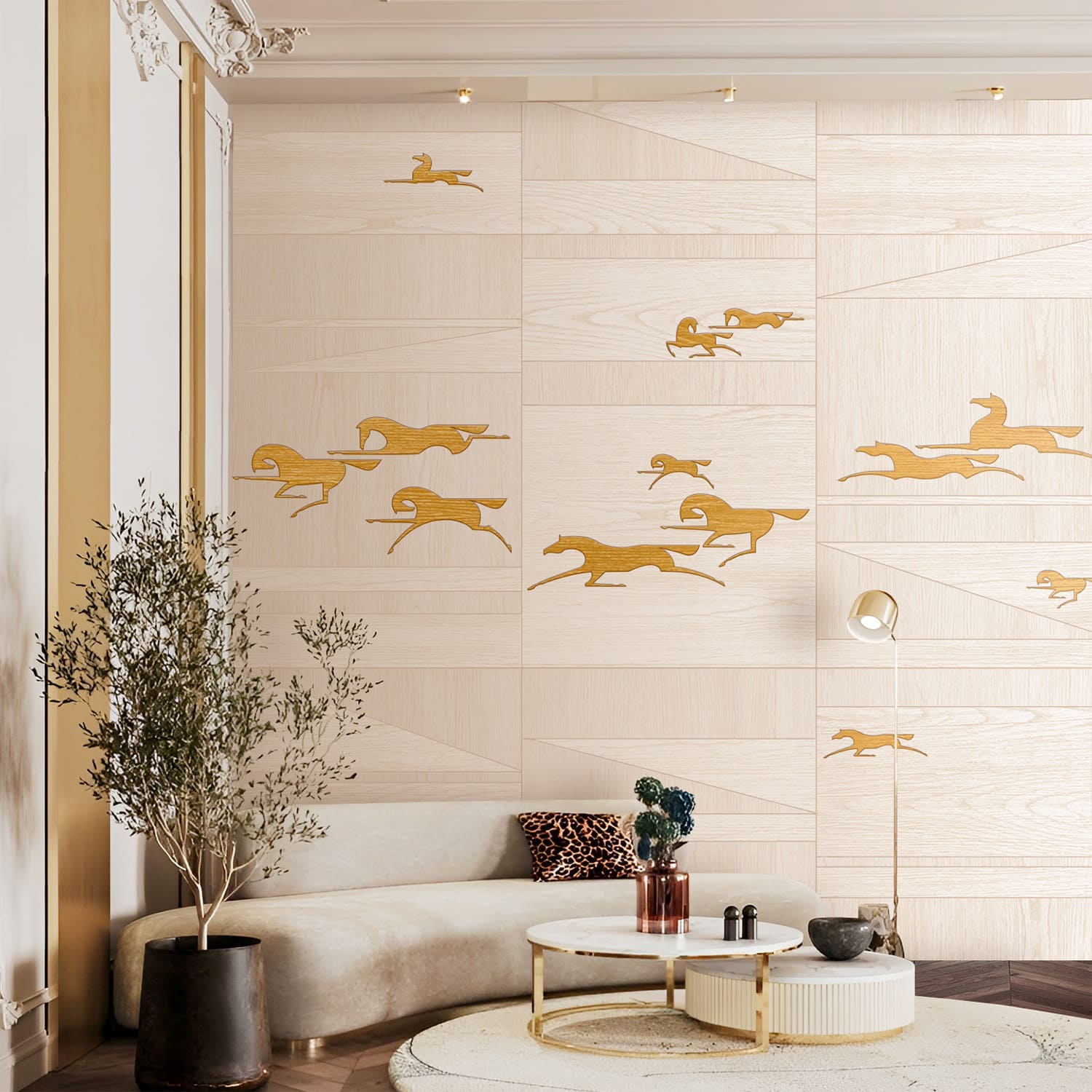 Стремительно летящие по степи легконогие лошади. Энергия ветра и бескрайние горизонты. Воздушная композиция из ритмических элементов расширит пространство стены в вашем интерьере. Особенность этой коллекции заключается в разном направлении шпона. Такой прием делает рисунок более объемным, переливающимся на свету. Это весьма трудоемкий процесс. Чтобы создать такой рисунок на одной панели, мастер тратит до 50 часов времени и несколько квадратных метров шпона.