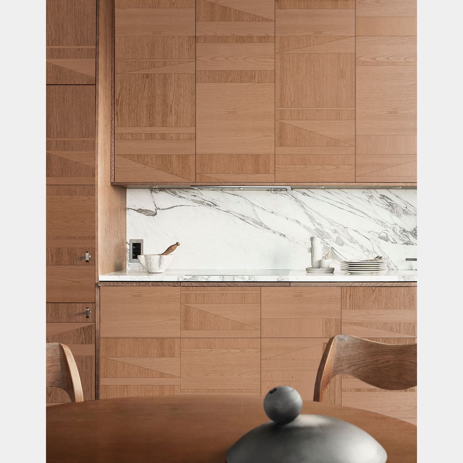 Шпон дуба, ореха, металлизированная инкрустация.
