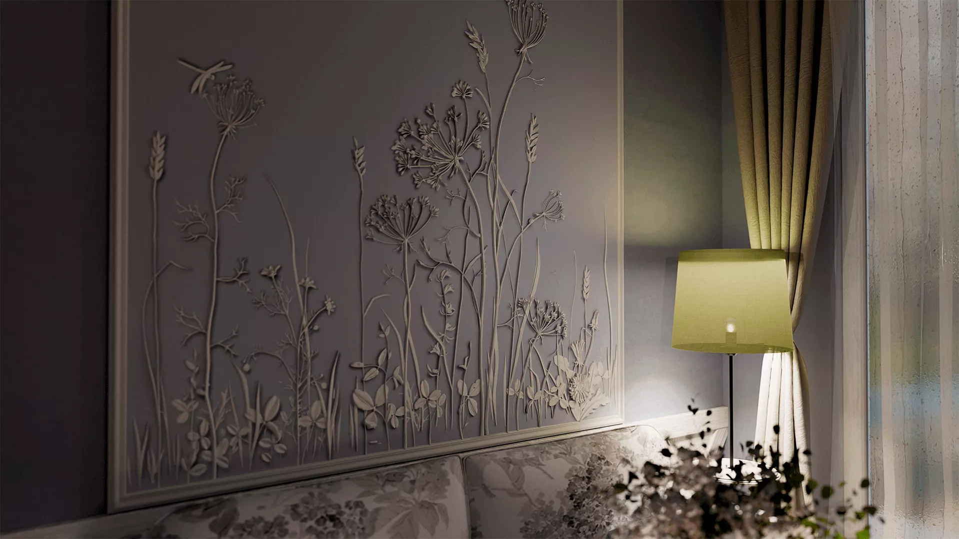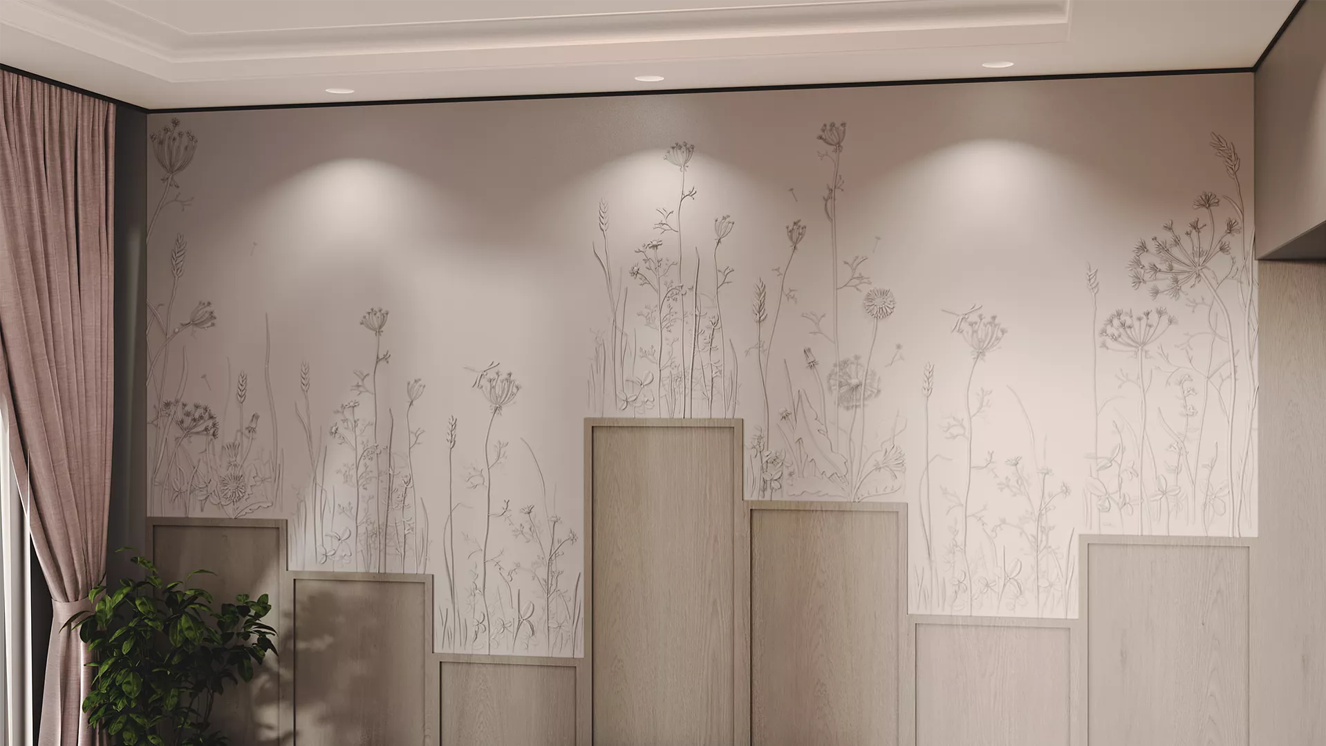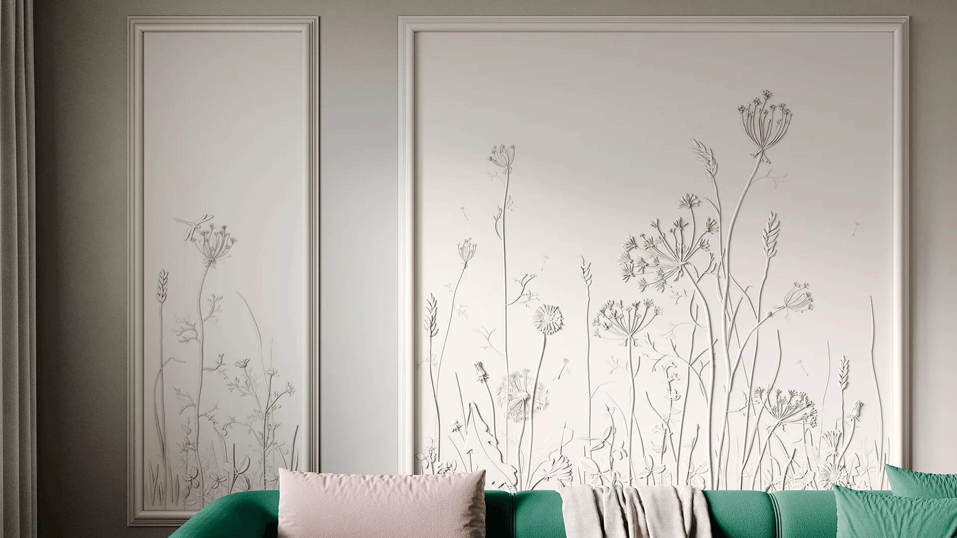 Завораживающее панно с растительным рисунком Provance способно привнести нежность природы в любой интерьер. Инсталляция размером 1800х3000 мм – это словно кадр из тайного сада или страницы редчайших фолиантов, где художественно воспроизведены изящные стебли, тонкие листья, пушистые соцветия и нежные цветы дикорастущих трав. Уникальный дизайн панелей превращает эту композицию в живую симфонию ботанических форм с тончайшей детализацией и природной гармонией.