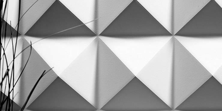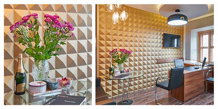 Гипсовые панели ZOOM отличает стильный глубокорельефный (высота достигает 41 мм) рисунок пирамидальной формы. Такой геометричный декор добавляет динамичности в любой современный интерьер, от техно и хай-тека до минимализма и контемпорари. 3D-панели можно использовать для отделки колонн или барной зоны в развлекательных заведениях, лаундж-зоны в отеле, стен в гостиной или кабинете. Если вы хотите подчеркнуть рельефность и привнести больше глубины в помещение окрасьте элементы в разные тона или добавьте подсветку (неповторимый эффект формируется за счет оригинальной игры света и тени). Панели отличаются экологичностью, четкостью декора, простотой монтажа, пожаростойкостью.
