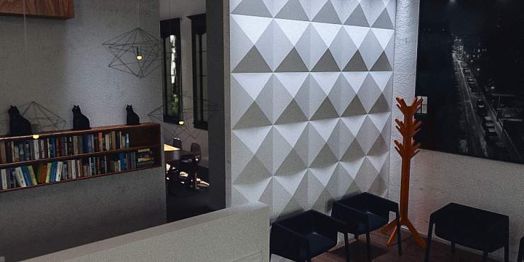 Коллекция ZOOM X4 — это многократно увеличенный популярный декор 3D-панелей ZOOM, вместо 16 геометрически идеальных пирамид дизайнеры разместили одну объемную пирамиду, дополнительно увеличив высоту рельефа на 10 мм. Такое эффектное решение придется по душе всем ценителям яркого дизайна, привлекающего внимание с первого взгляда. Гипсовые панели подойдут для отделки стен в просторных помещениях, от приемной зоны в крупной компании до лекториев и читальных залов. Декор гармонично сочетается с большинством современных стилей, в том числе конструктивизмом и минимализмом, а для еще большего акцента на объемности геометрического узора достаточно добавить подсветку.