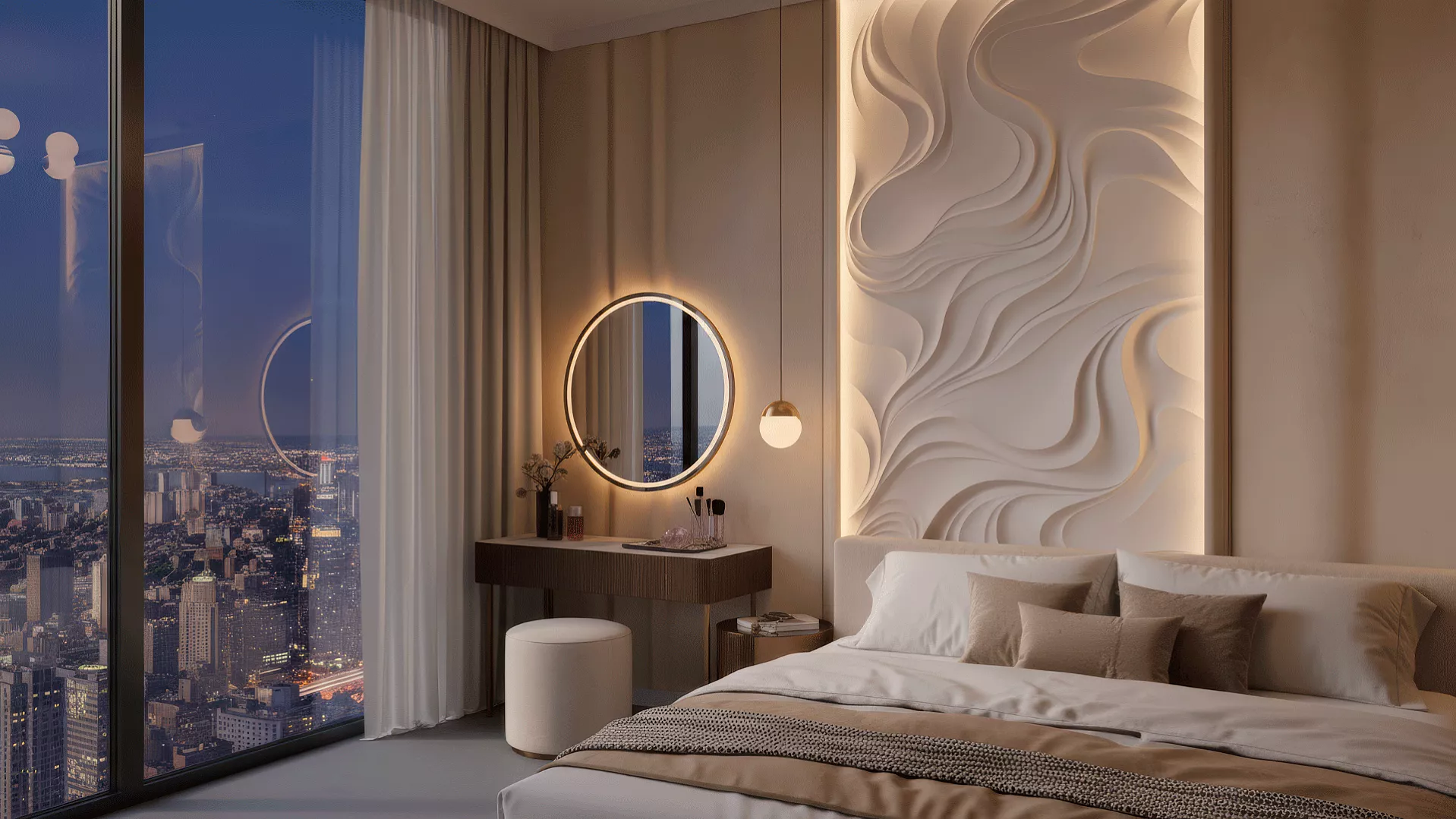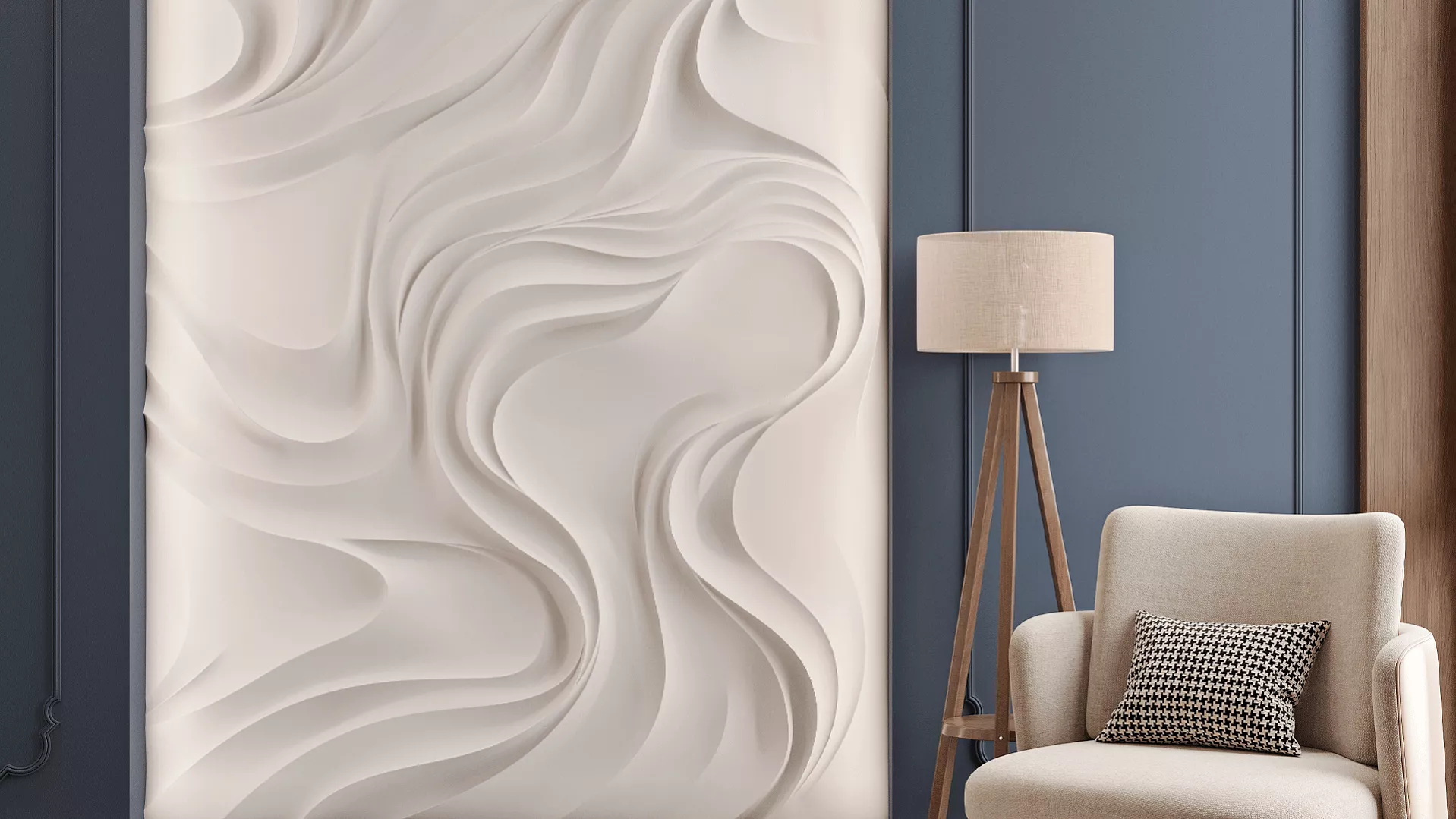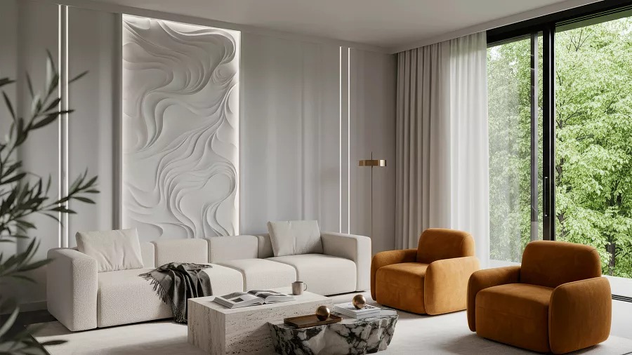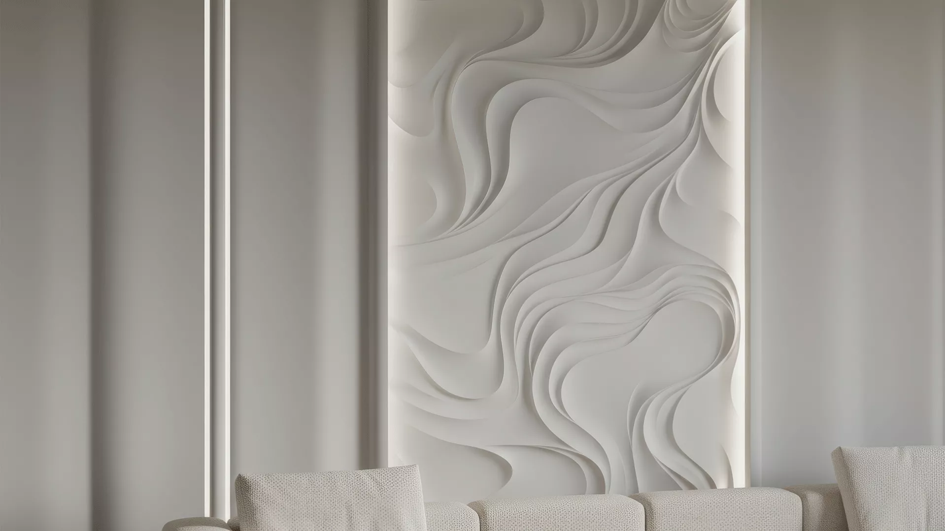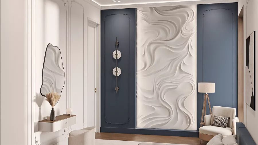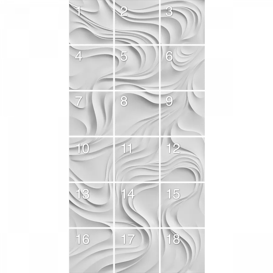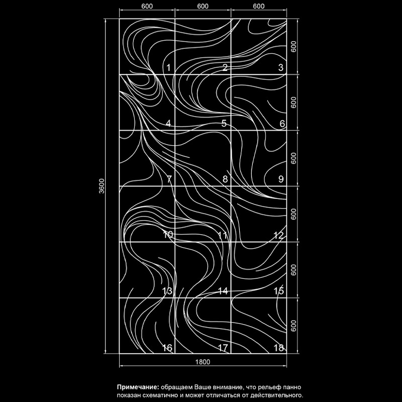 MISTERIO – это больше, чем просто декоративное панно. Это архитектурная метафора таинственных потоков и невидимых энергий, завораживающая симфония форм размером 3600 х 1800 мм. Инсталляция собирается из 18 гипсовых 3D-панелей с разной глубиной рельефа: от деликатных 12–15 мм до внушительных 87 мм.