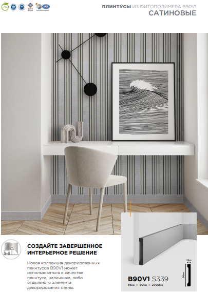 Декорированный напольный плинтус B90V1 S339, САТИНОВЫЙ. Уникальное сочетание стиля, прочности и функциональности делает эти плинтусы универсальным выбором для любого интерьера, включая помещения с повышенной влажностью, а также в коммерческих пространствах. B90V1S339 может использоваться в качестве плинтуса, наличника, либо отдельного элемента декорирования стены. Производство Южная Корея, Материал - полистирол высокой плотности. Прекрасны индивидуально или для комбинирования со стеновыми панелями: LV133S339S, LV128S339S, LV127LS339S, LV124S339S, LV123S339S, LV122S339S, LV121S339S. Для монтажа рекомендуется монтажный клей HI WOOD HD700 или HD1000. Размеры 90 × 14 × 2700 мм