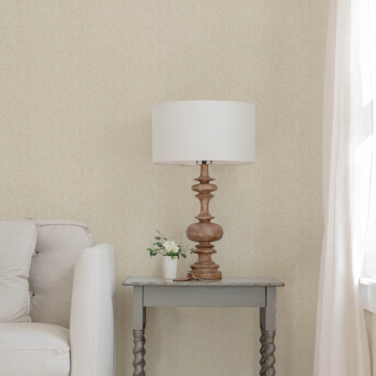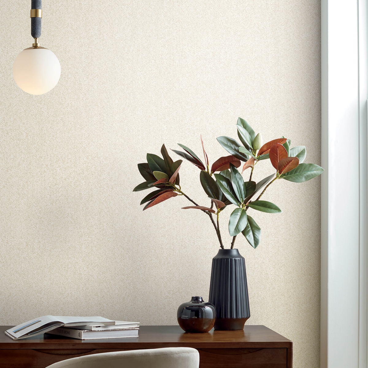 Нейтральные оттенки идеально сочетаются с этими изысканными обоями под ткань. Мелкий шевронный принт напоминает твидовую ткань, особенно благодаря сочетанию серо-коричневых и кремовых оттенков.