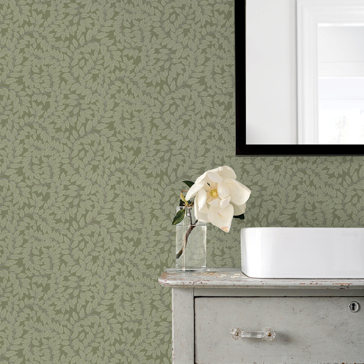 Придайте своему интерьеру естественную изысканность с помощью плюща. Эти элегантные ботанические обои с изображением вьющихся стеблей с заостренными бледно-зелеными листьями контрастируют с темно-зеленым фоном.