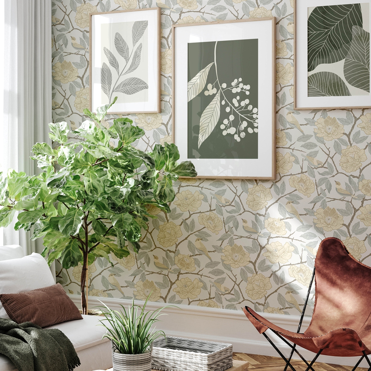 Придайте своему интерьеру игривый, женственный шарм с помощью этих обоев с растительным орнаментом. Пышный раскидистый куст роз, который облюбовали любопытные воробьи, изображен на иллюстративном рисунке в пастельно-желтых, бледно-охристых, светло-голубых и коричневых тонах на белом фоне.