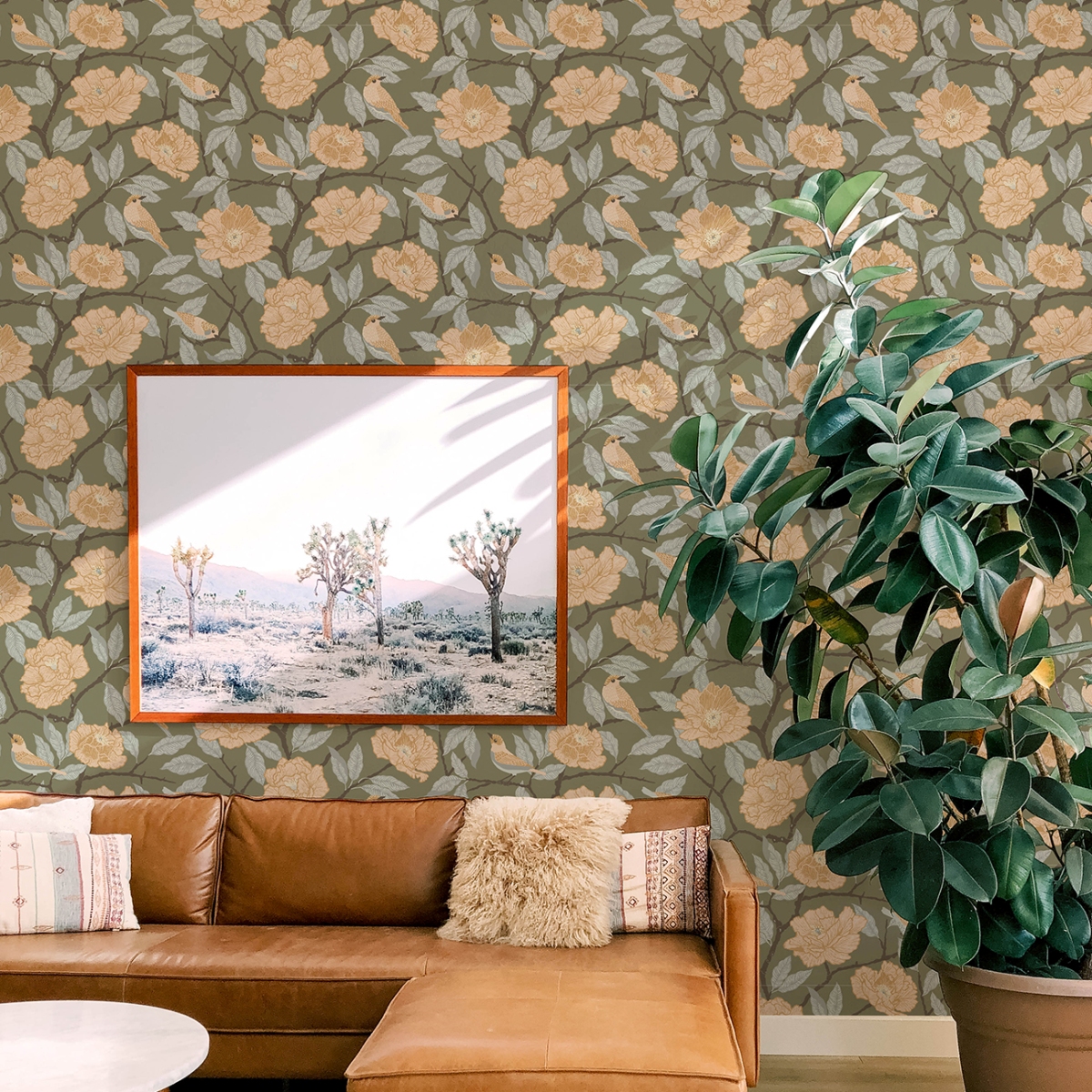 Преобразите свой интерьер с помощью женственных и красивых обоев с лесным ботаническим орнаментом. Любопытные воробьи сидят на пышном раскидистом кусте роз, а иллюстративные формы окрашены в песочно-розовые, светло-голубые и коричневые тона на фоне мшисто-зелёного цвета.