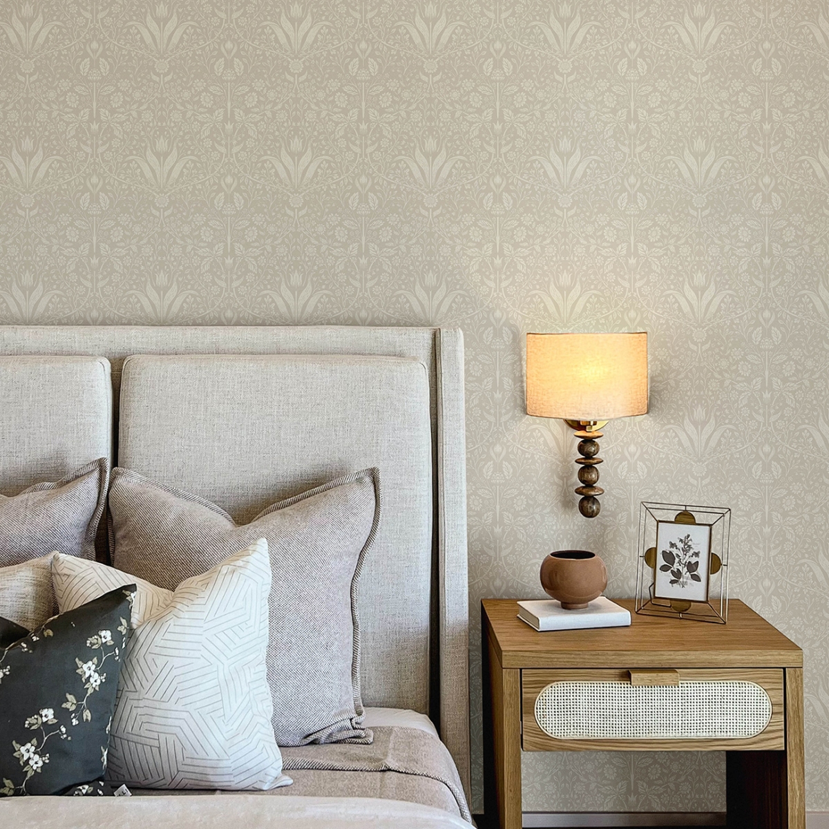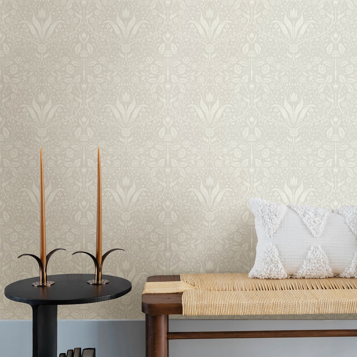 Эти очаровательные обои с фестонами посвящены первым весенним цветам! Тюльпаны, маргаритки и другие ранние цветы изящно прорисованы старинной белой краской на светло-сером фоне.