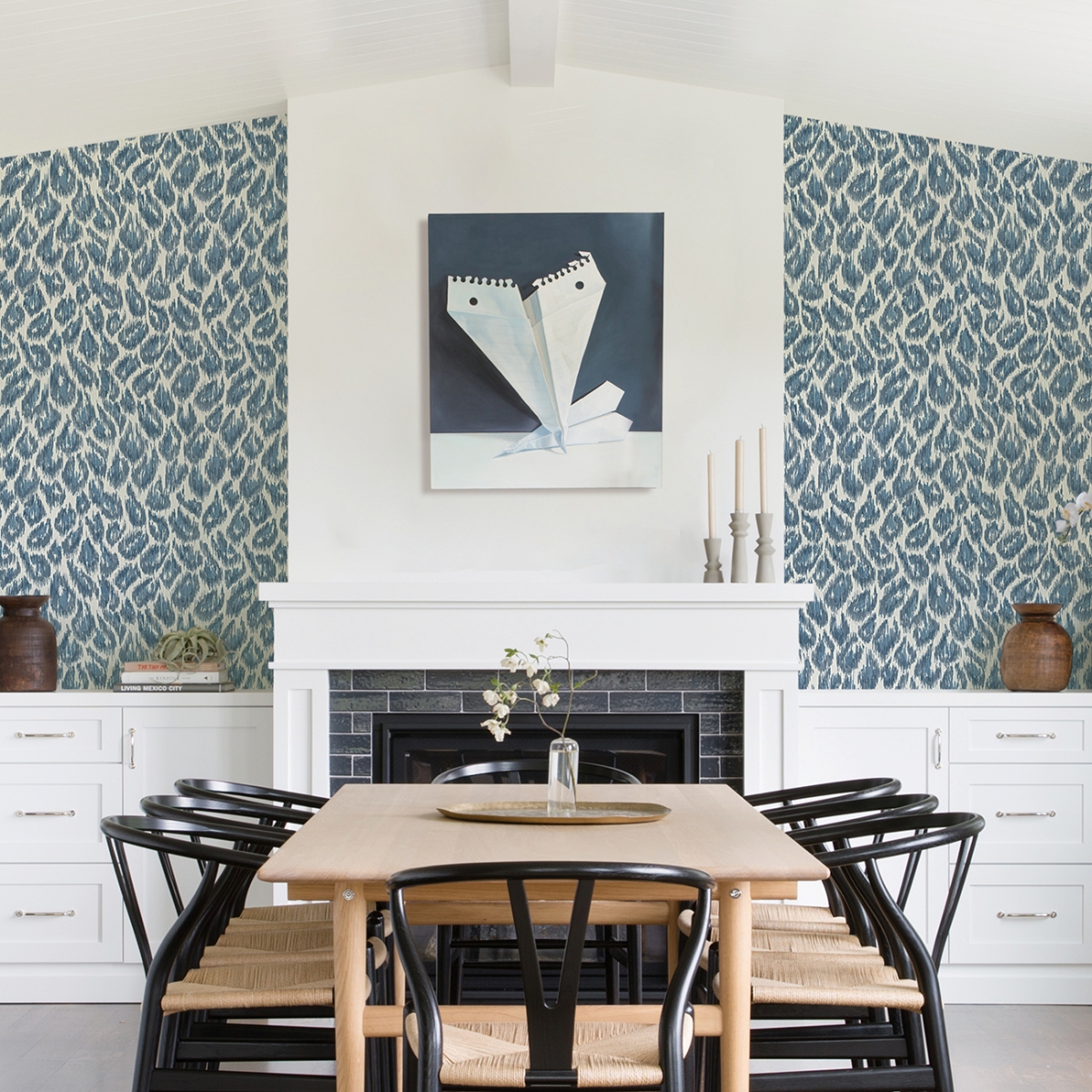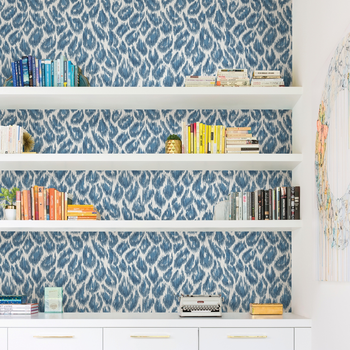 Леопардовый принт обретает современный вид с этими обоями с анималистичным принтом! Пятна большой кошки выполнены чернилами в оттенках синего с отделкой икат – наложением тонких нитей, придающих рисунку тактильные ощущения. Electra – это обои с акриловым покрытием без клея.