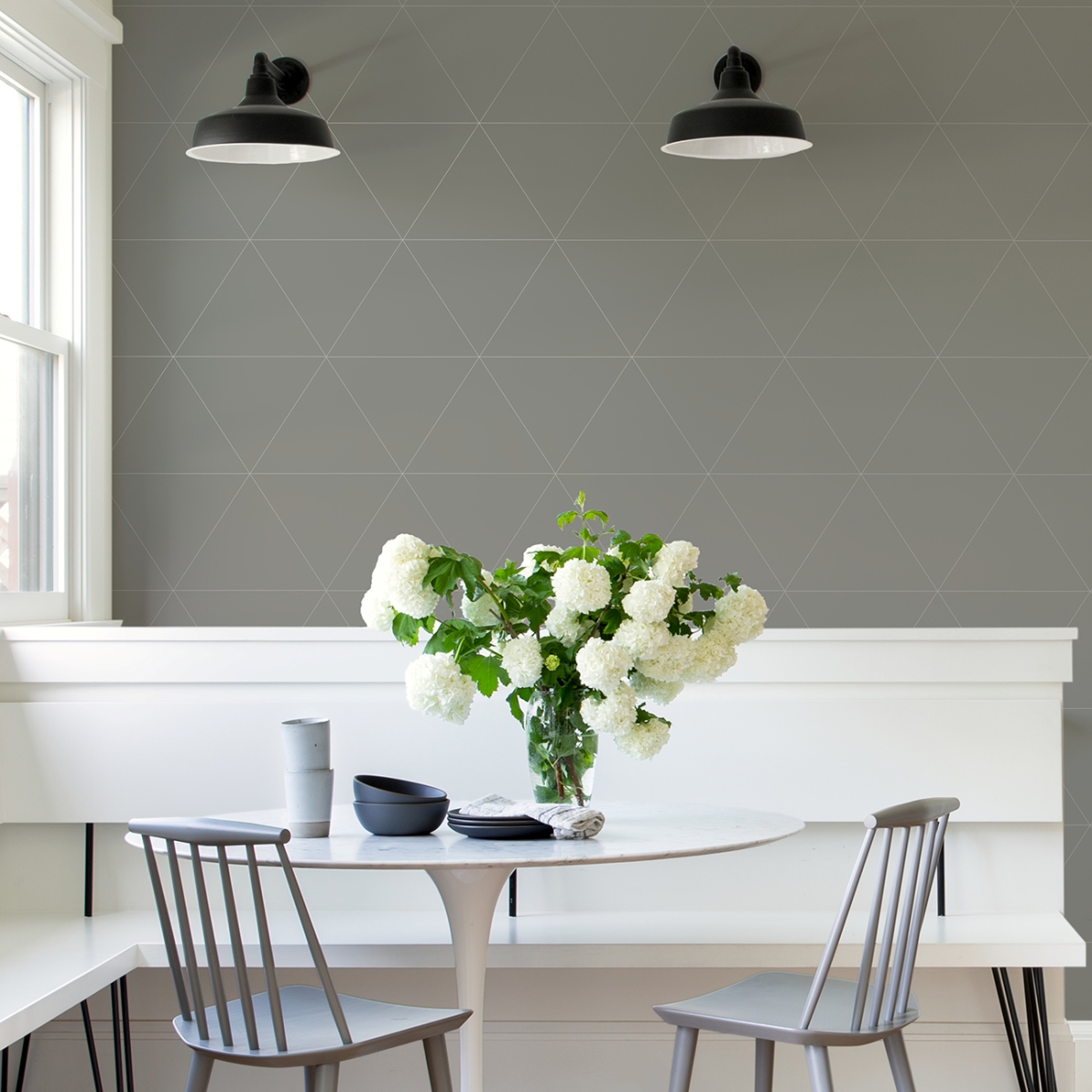 Небольшие детали могут оказать огромное влияние на ваше пространство. Эти геометрические обои насыщенного серого цвета, разделенные тонкими полосами металлизированной бронзы, создают крупные треугольники. «Сумерки» — это акриловые обои без клея.
