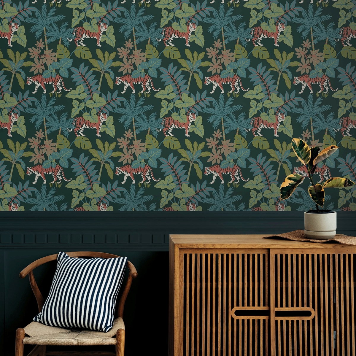 Эти очаровательные обои с изображением джунглей выводят кошачью походку на совершенно новый уровень. Оранжевые тигры рыщут по пышной флоре тропического леса, выполненной в ярких синих, зеленых, желтых и оранжевых тонах на глубоком темно-синем фоне. «Caspian» — это неклееные флизелиновые обои размером 20,5 дюймов в ширину и 33 фута в длину, площадью примерно 56,4 квадратных футов (примерно 56,4 квадратных футов) на рулон.