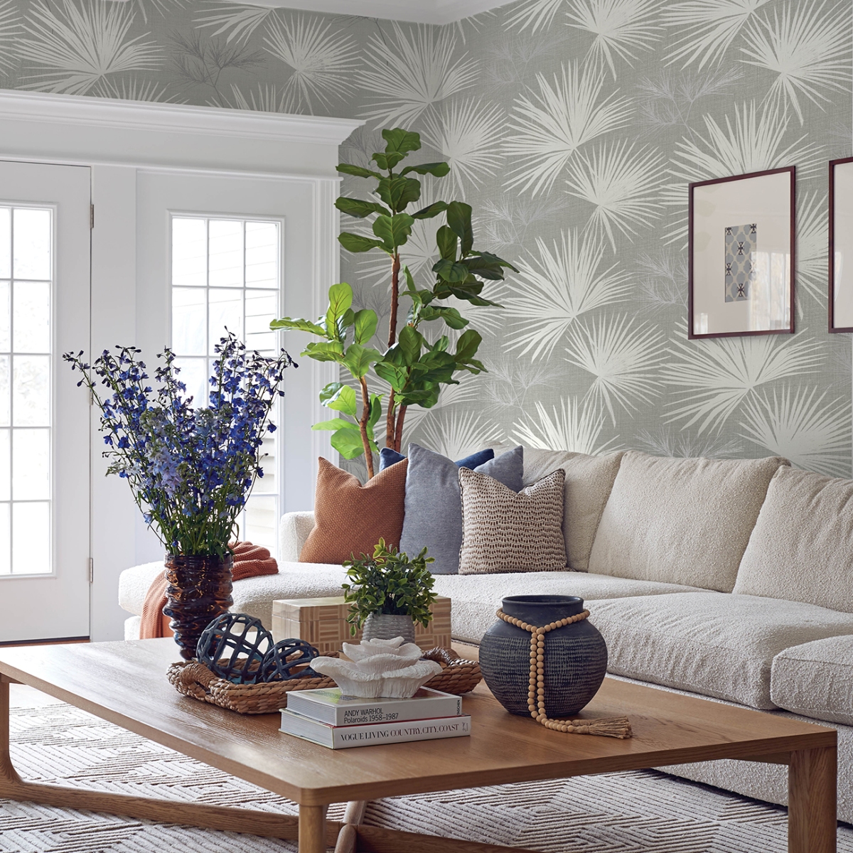 Большие белые веерные пальмы, оттенённые тонкими металлизированными серебристыми листьями, придают стенам дополнительную воздушность благодаря серому фону с рыхлыми ткаными деталями. Hatteras — это неклееные флизелиновые обои размером 20,5 дюймов в ширину и 33 фута в длину, что составляет площадь примерно 56,4 квадратных футов (примерно 56,4 квадратных футов) на рулон.