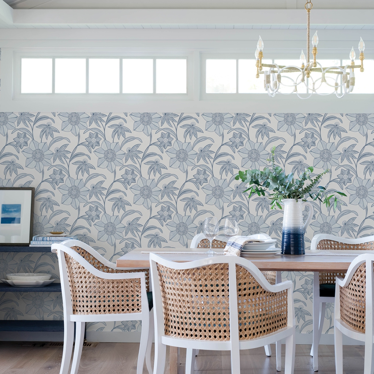 Объёмные цветы небесной формы образуют вьющиеся дорожки в этом художественном цветочном дизайне. Линии выполнены чернилами в оттенках синего на белом фоне. «Звёздный цветок» — это неклееные флизелиновые обои размером 20,5 дюймов в ширину и 33 фута в длину, что составляет площадь примерно 56,4 квадратных футов (примерно 56,4 квадратных футов) в рулоне.