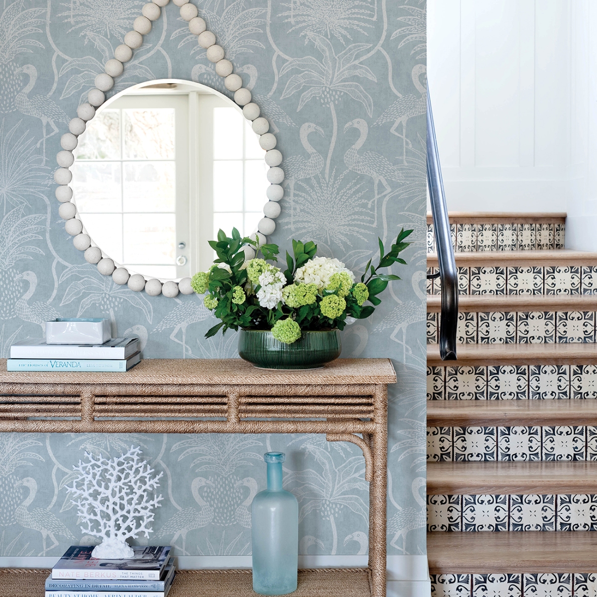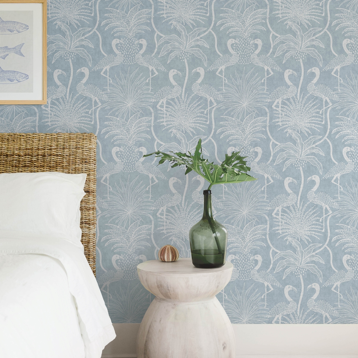 Фламинго собираются вокруг пальм на этих восхитительно причудливых тропических обоях. Здесь они представлены в белом цвете на бледно-бирюзовом фоне. Biscayne — это неклееные флизелиновые обои размером 27 дюймов в ширину и 27 футов в длину, что составляет площадь примерно 60,8 квадратных футов на рулон.