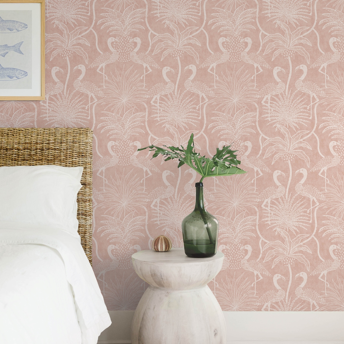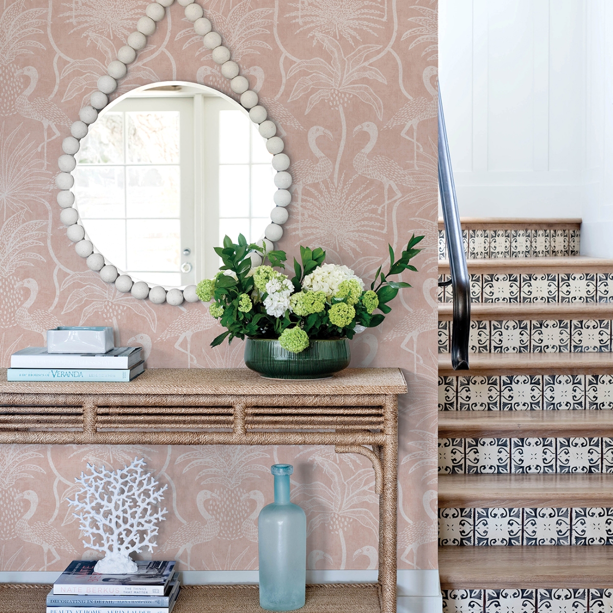 Фламинго собираются вокруг пальм на этих восхитительно причудливых тропических обоях. Здесь они представлены в белом цвете на бледно-бирюзовом фоне. Biscayne — это неклееные флизелиновые обои размером 27 дюймов в ширину и 27 футов в длину, что составляет площадь примерно 60,8 квадратных футов на рулон.
