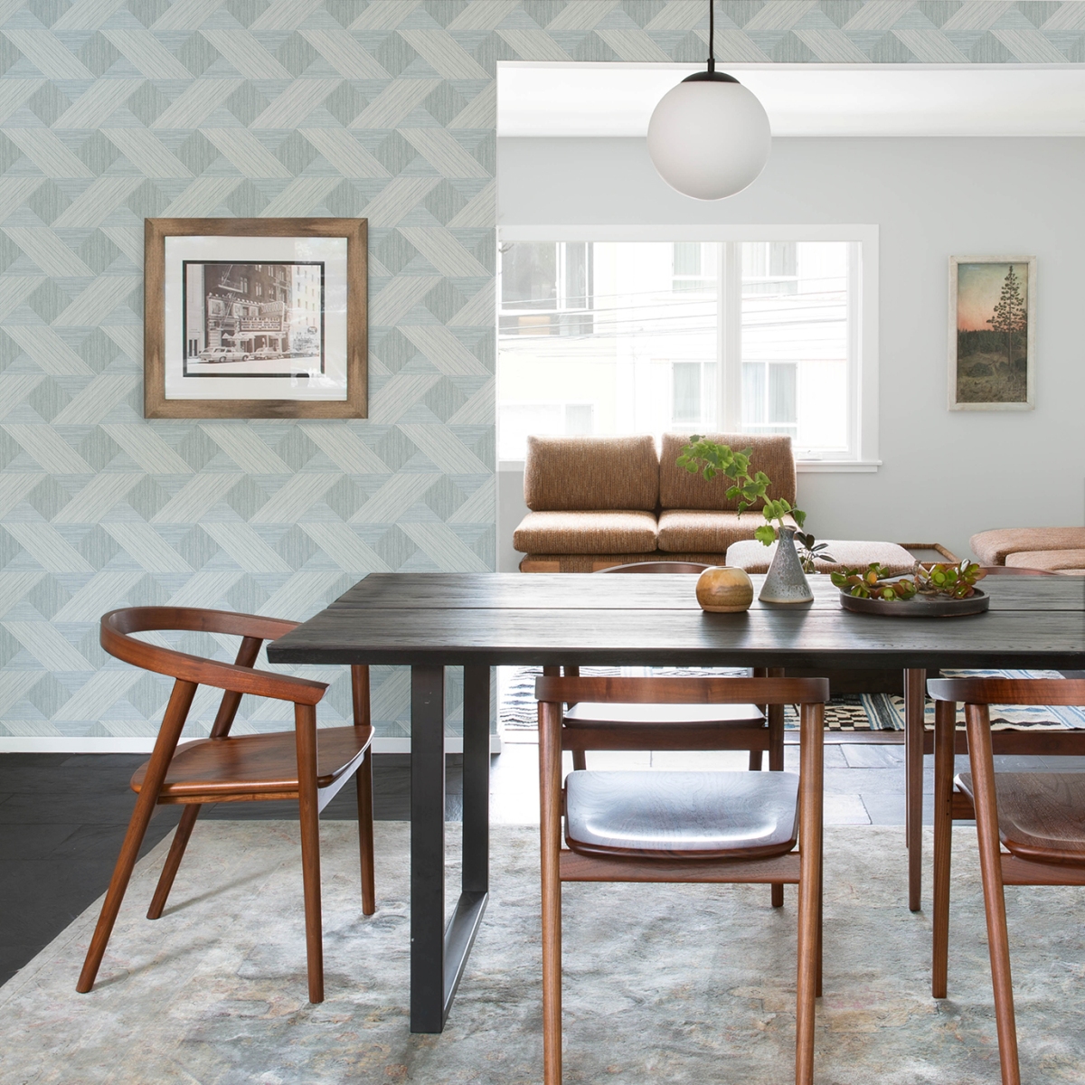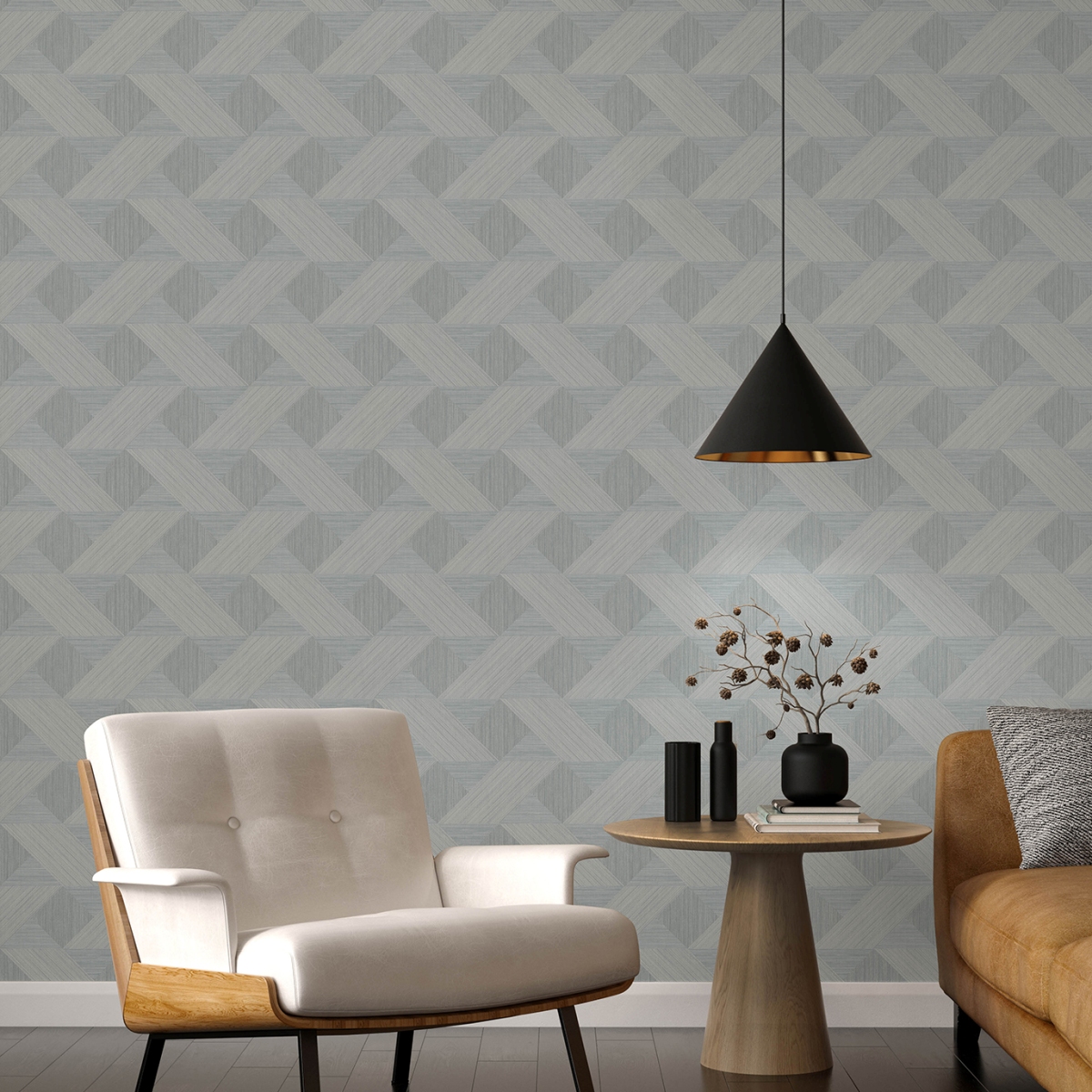 Эти изысканные геометрические обои имитируют замысловатый переплетённый рисунок паркетного пола. Узор состоит из треугольников, квадратов и ромбов насыщенного чёрного и угольно-серого цветов с разной текстурой. Presley — это неклееные флизелиновые обои размером 20,5 дюймов в ширину и 33 фута в длину, что составляет площадь одного рулона около 56,4 квадратных футов.