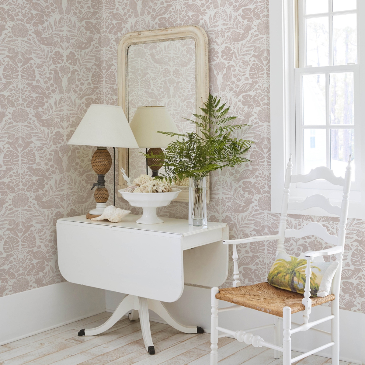 Эти игривые дамастовые обои придутся по вкусу любителям птиц! Туканы, какаду, попугаи и колибри расположились среди пышных тропических цветов и растений. Детали напечатаны в пудрово-розовом цвете на белом фоне.