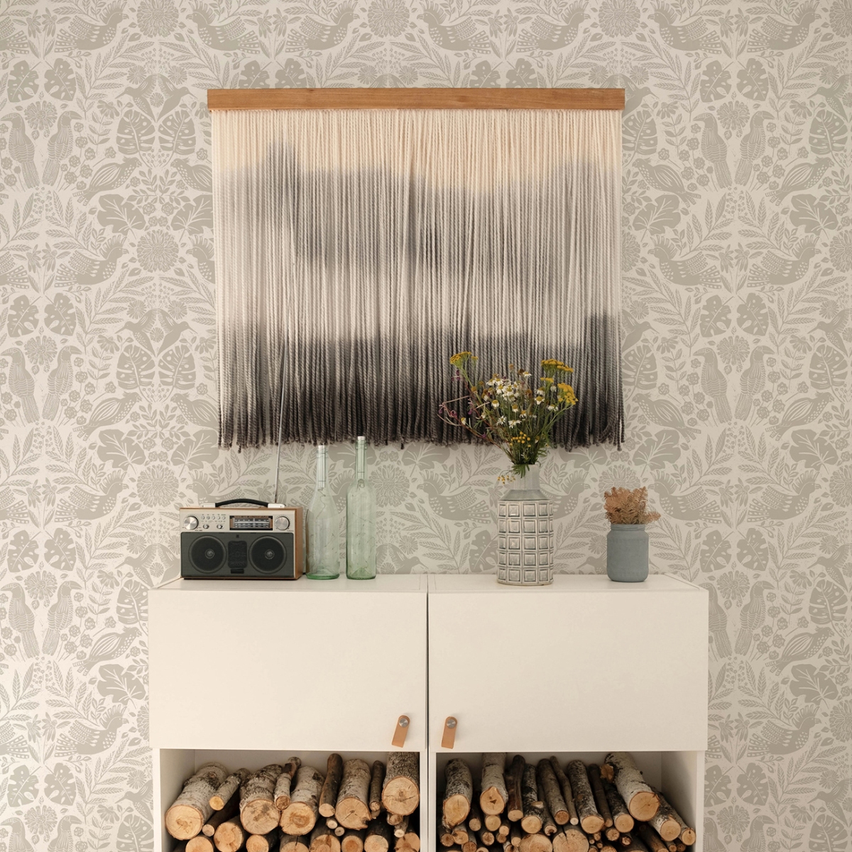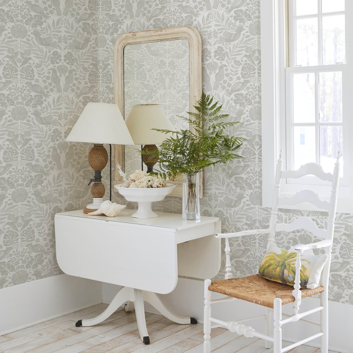 Любители птиц, ликуйте! На этих игривых дамасковых обоях изображена разнообразная тропическая стая, расположившаяся среди пышной листвы. Детали напечатаны светло-серым цветом на белом фоне.