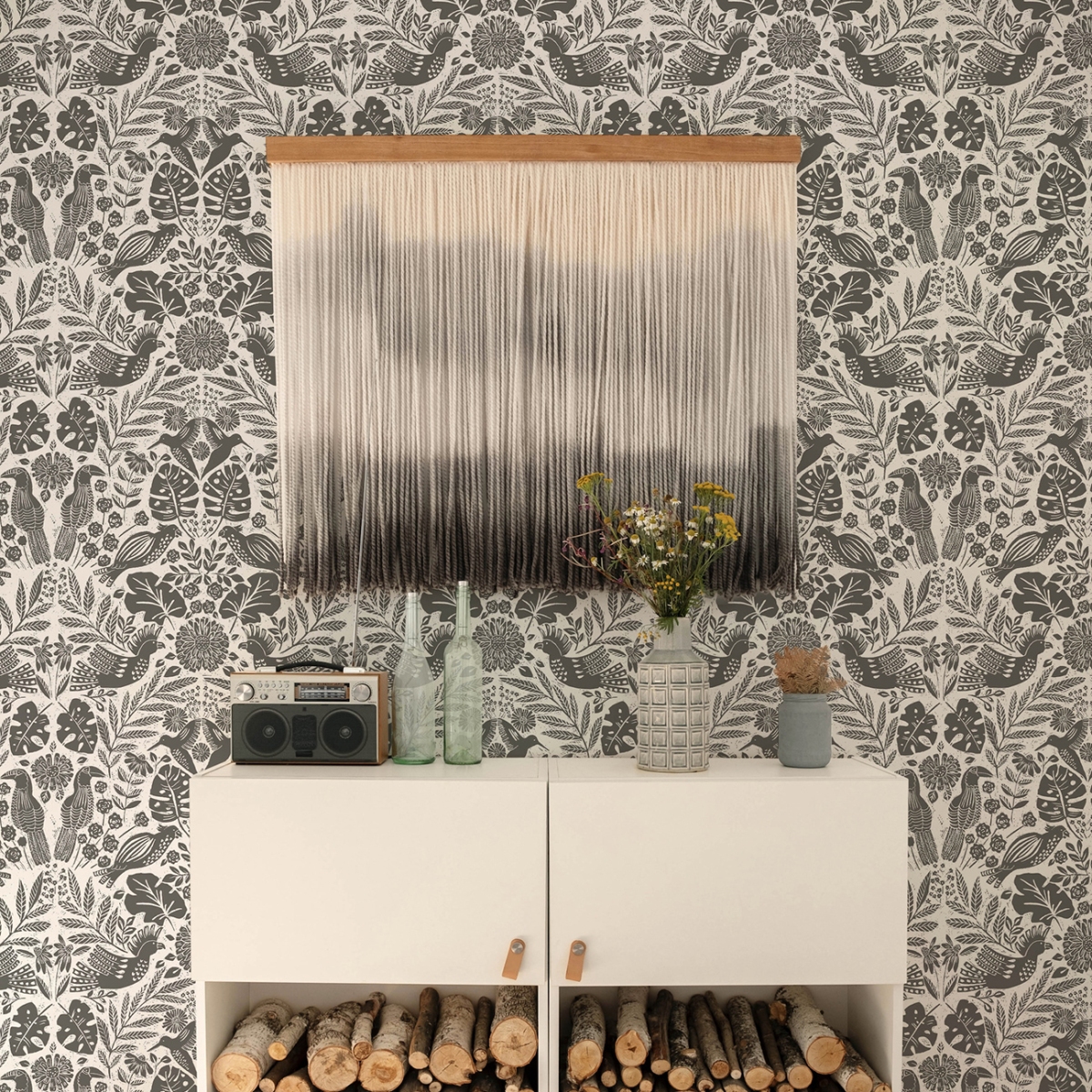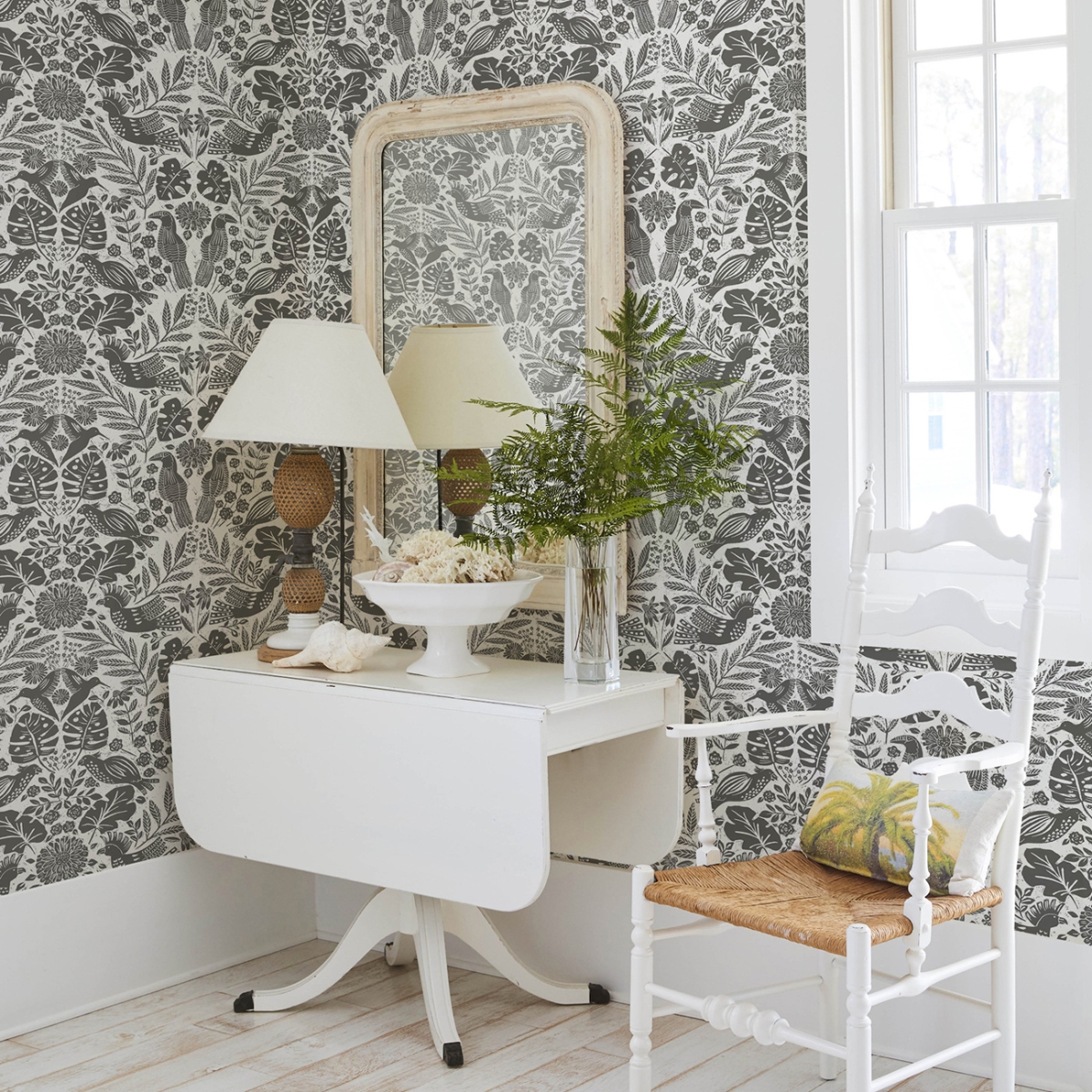 Этот игривый дамаск создан для любителей птиц. Туканы, попугаи, какаду и колибри обитают среди тропических цветов и растений. Детали напечатаны угольно-серым цветом на белом фоне.