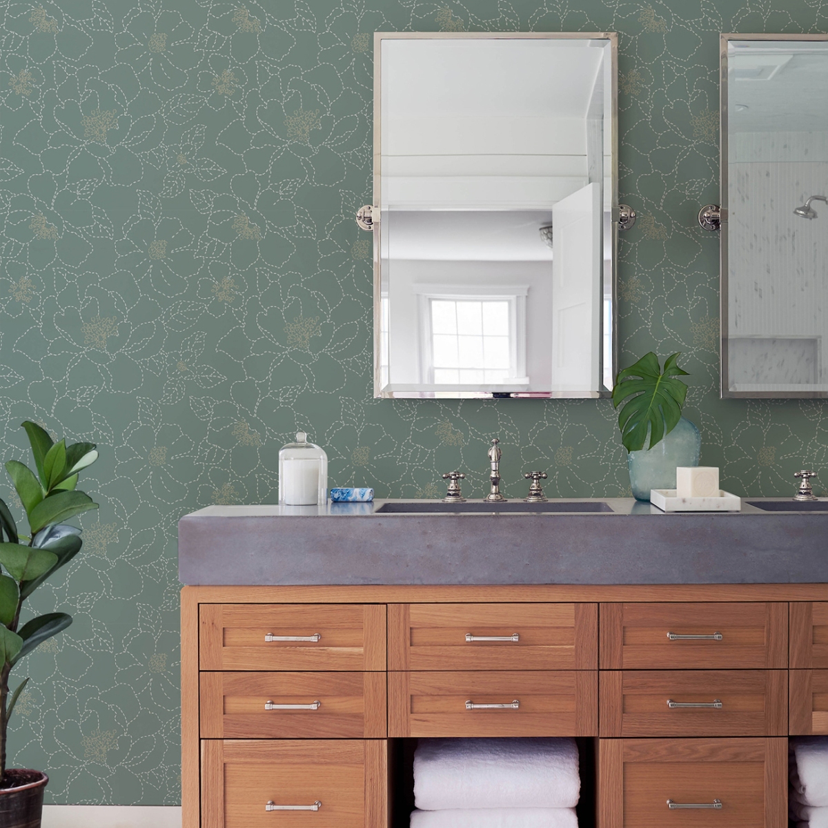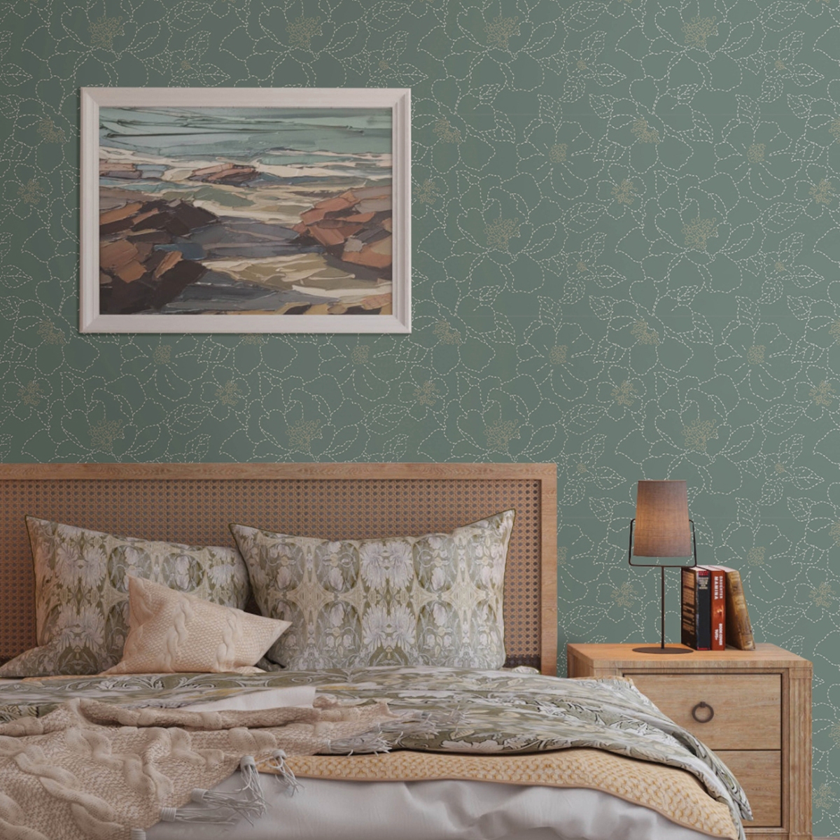 Добавьте в свой интерьер немного простого женственного очарования с помощью этого цветочного узора. Цветы обведены белой строчкой на бледно-сине-зелёном фоне, а их сердцевины украшены золотистым напылением.