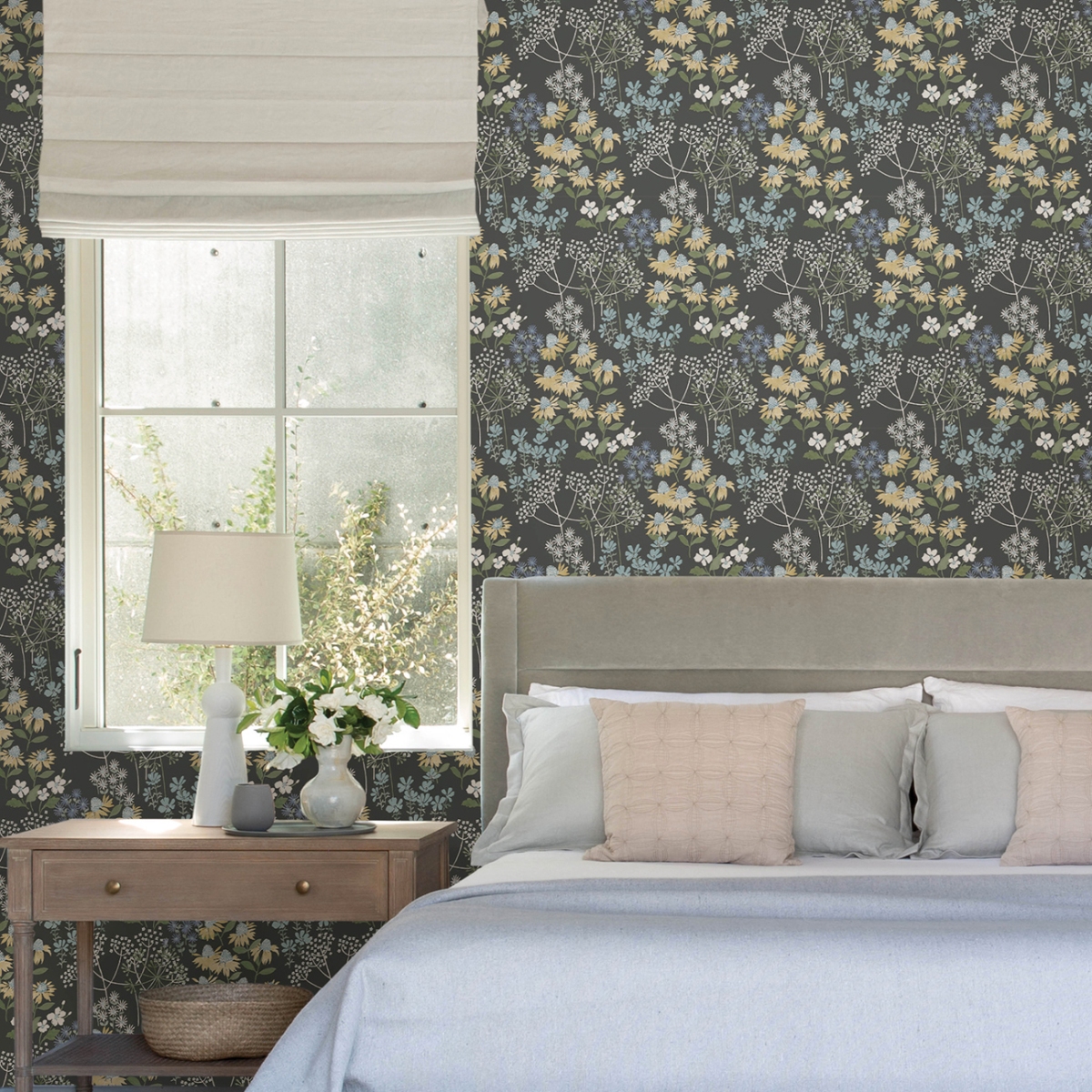 Эти живописные цветочные обои придадут вашему интерьеру мягкий, женственный шарм. Первые буйные весенние цветы окрашены в акварельные оттенки синего, зелёного, бледно-жёлтого и белого на насыщенном угольно-сером фоне.