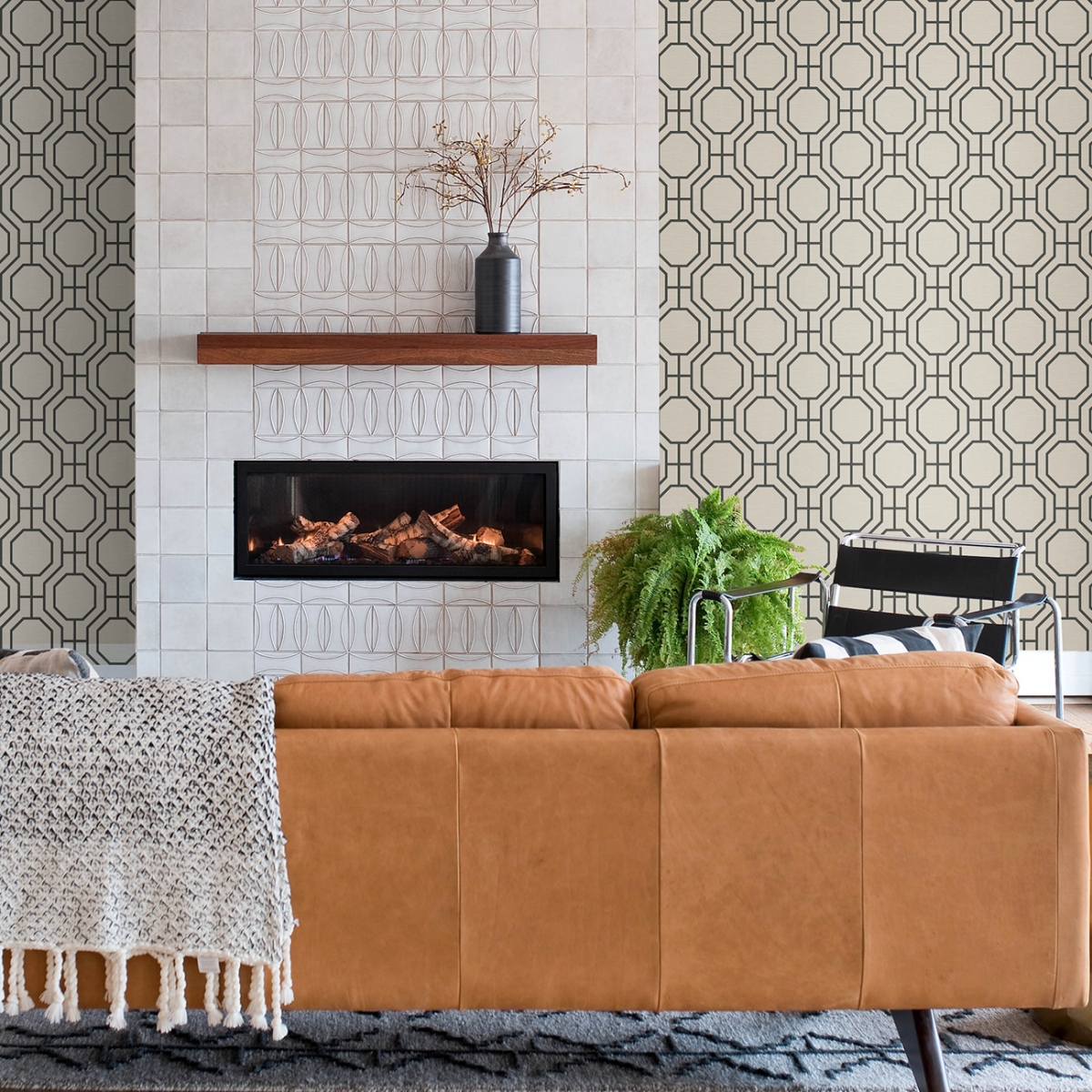 Эта современная и мужественная решётка вдохнёт новую жизнь в ваш интерьер. Восьмиугольная решётка выполнена в матовом чёрном цвете на фоне искусственной травы кремового и серо-коричневого оттенков с тактильными текстурными деталями.