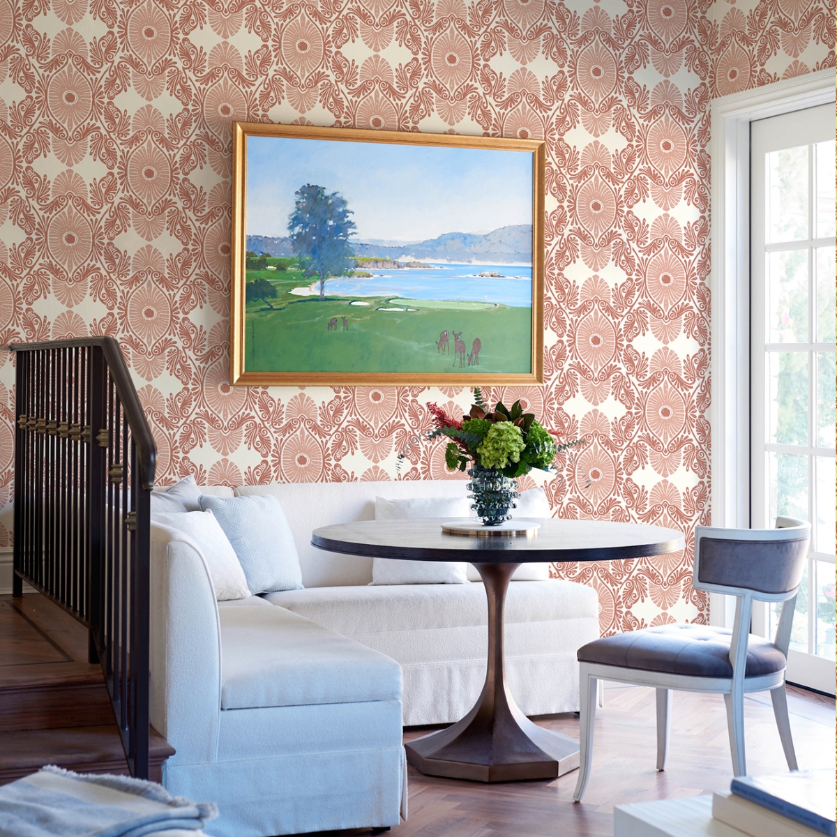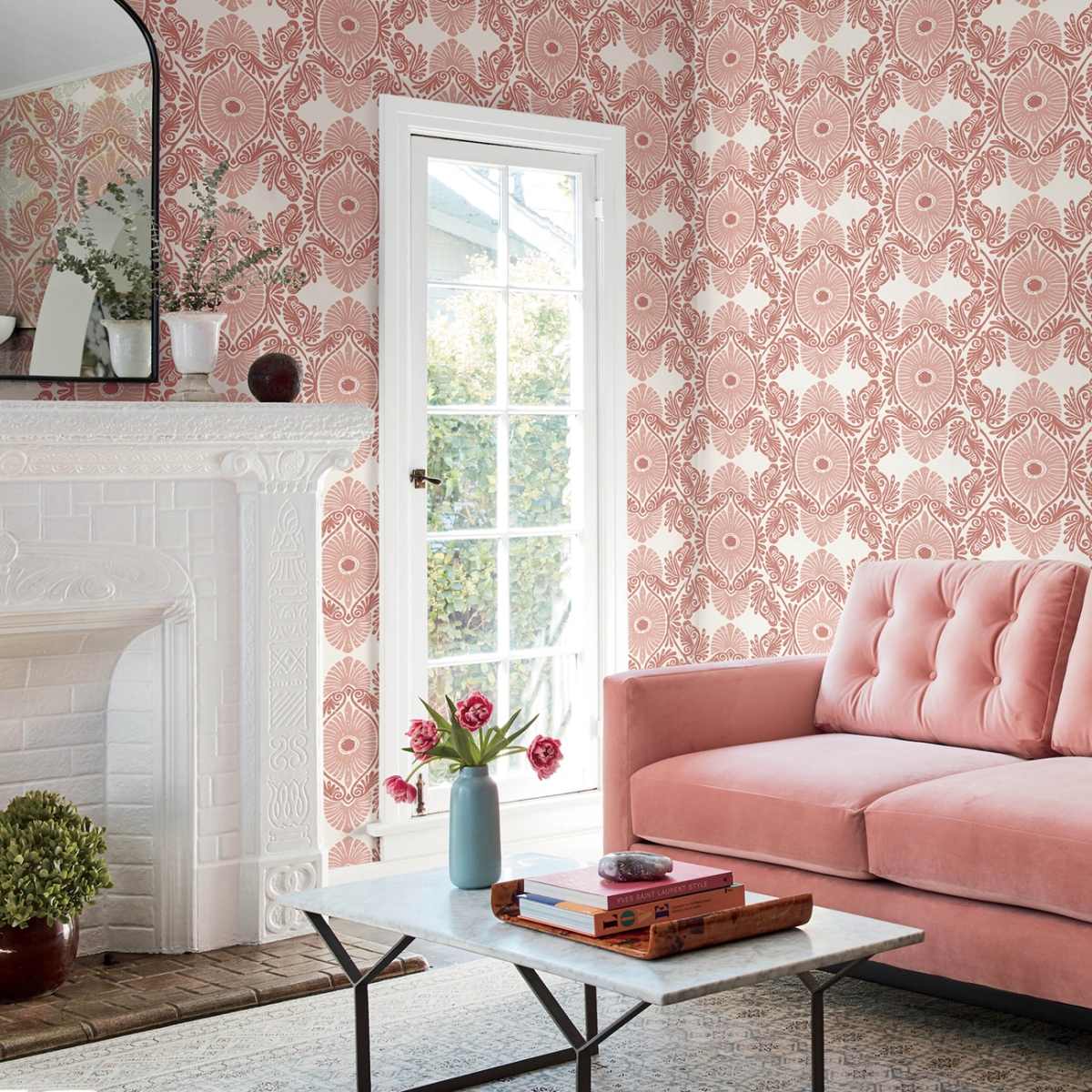Придайте своему интерьеру новый импульс с помощью этих обоев с теплым цветом и богемным стилем. Розовые цветочные медальоны обрамлены витиеватыми красными завитками, а детали подчеркнуты чистым белым цветом