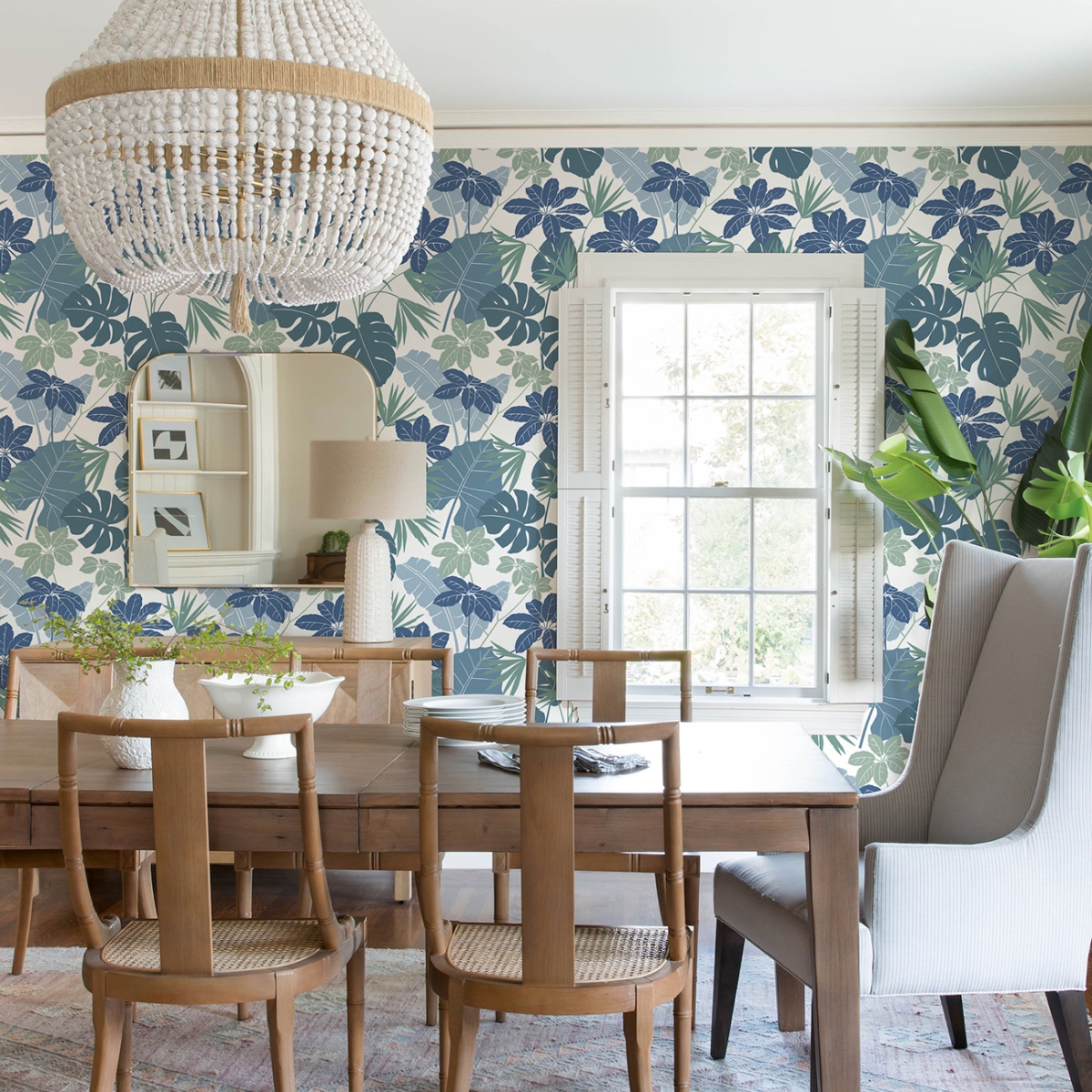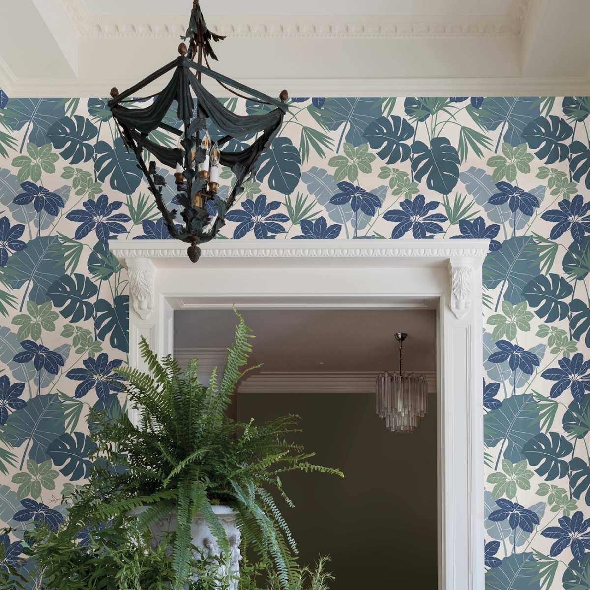 Создайте свой собственный тропический уголок с помощью этих роскошных ботанических обоев. Силуэты растений тропического леса окрашены в оттенки синего, бирюзового и нефритового на белом фоне.