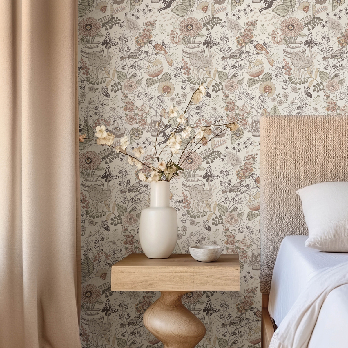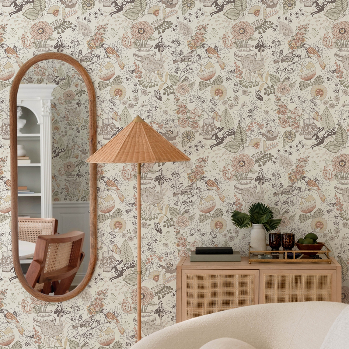 Этот яркий дизайн обоев представляет собой смесь птиц, бабочек и кроликов, исследующих своё цветочное окружение. Иллюстративные стили чередуют чёрно-белые и полноцветные фрагменты, представленные в яркой радужной палитре. Whimsy — это неклееные флизелиновые обои размером 20,5 дюймов в ширину и 33 фута в длину, что составляет площадь около 56,4 квадратных футов (примерно 56,4 квадратных футов) на рулон.
