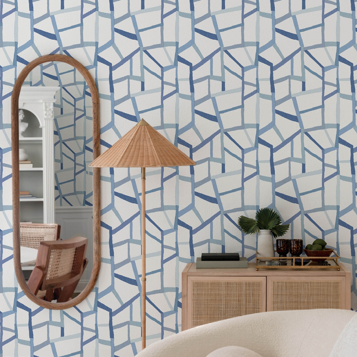 Динамичная сетка геометрических фигур дополнена яркой палитрой розового, оранжевого и малинового цветов, а также богатой текстурой, имитирующей лён. Tate — это неклееные флизелиновые обои размером 20,5 дюймов в ширину и 33 фута в длину, что позволяет покрыть площадь около 56,4 квадратных футов одним рулоном.