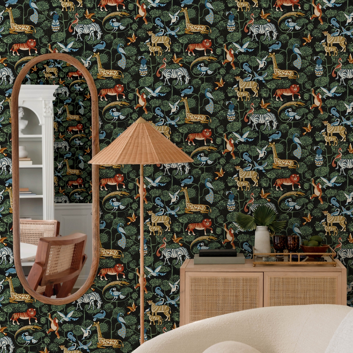Фантастическая интерпретация обитателей джунглей добавляет неожиданную дозу удовольствия. Животные изображены чернилами синего, жёлтого и оранжевого оттенков, а чёрный фон оживлён смягченными силуэтами деревьев, нанесёнными насыщенным зелёным цветом. Rigby — это неклееные флизелиновые обои размером 20,5 дюймов в ширину и 33 фута в длину, покрывающие площадь около 56,4 квадратных футов (примерно 56,4 квадратных футов) на рулон.