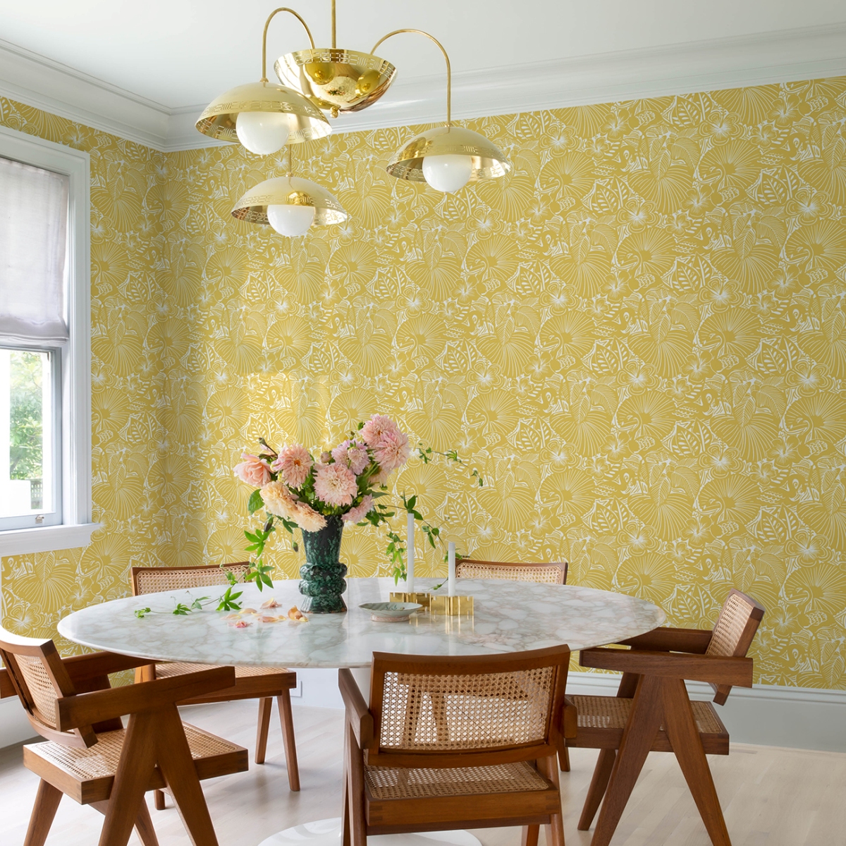 На этом игривом принте фламинго расхаживают среди пышных тропических цветов и листвы. Рисунок выполнен белым цветом на ярко-жёлтом фоне. Idalia — это неклееные флизелиновые обои размером 27 дюймов в ширину и 27 футов в длину, что составляет площадь около 60,8 квадратных футов (примерно 60,8 квадратных футов) в одном рулоне.