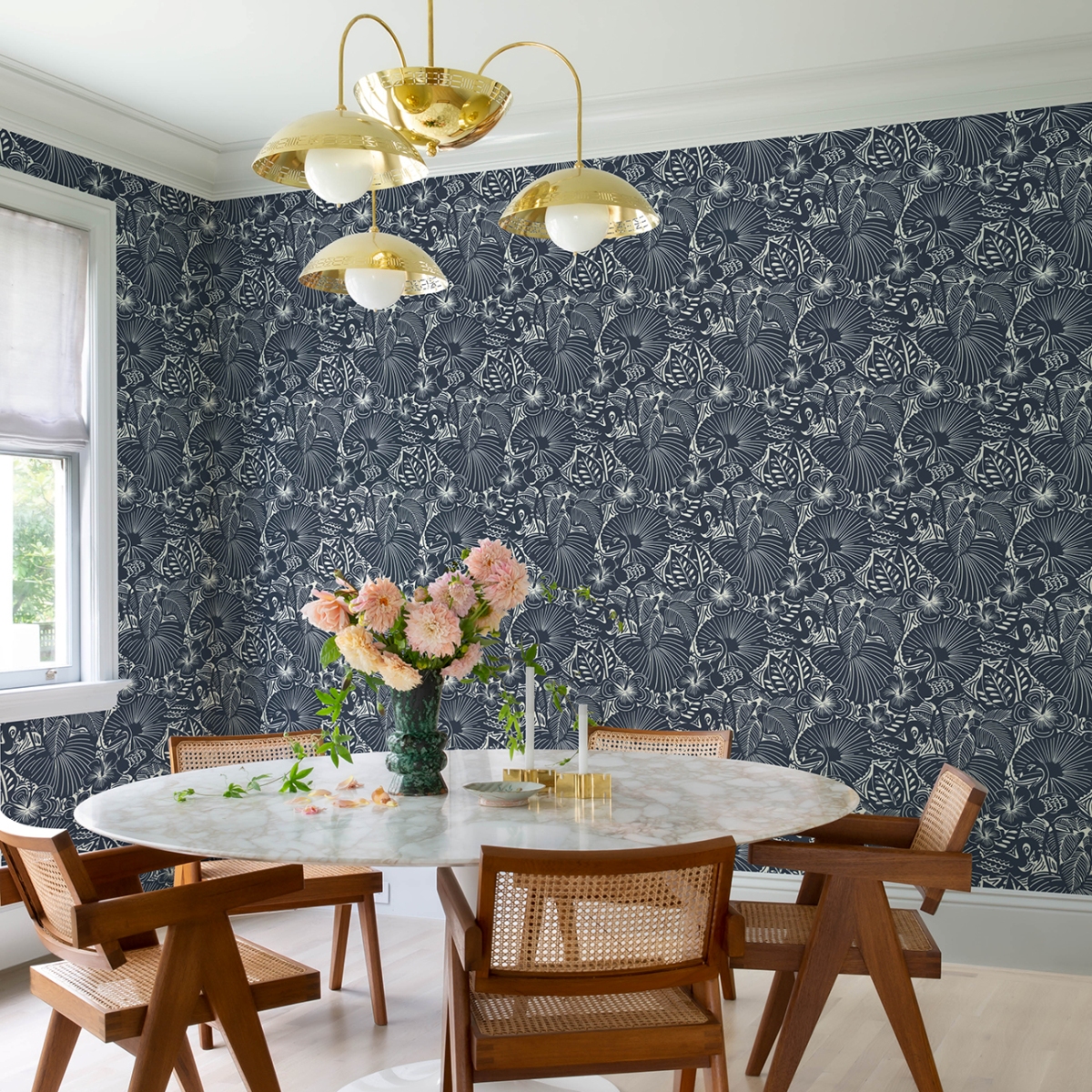 На этом игривом принте фламинго расхаживают среди пышных тропических цветов и листвы. Рисунок выполнен белым цветом на ярко-жёлтом фоне. Idalia — это неклееные флизелиновые обои размером 27 дюймов в ширину и 27 футов в длину, что составляет площадь около 60,8 квадратных футов (примерно 60,8 квадратных футов) в одном рулоне.