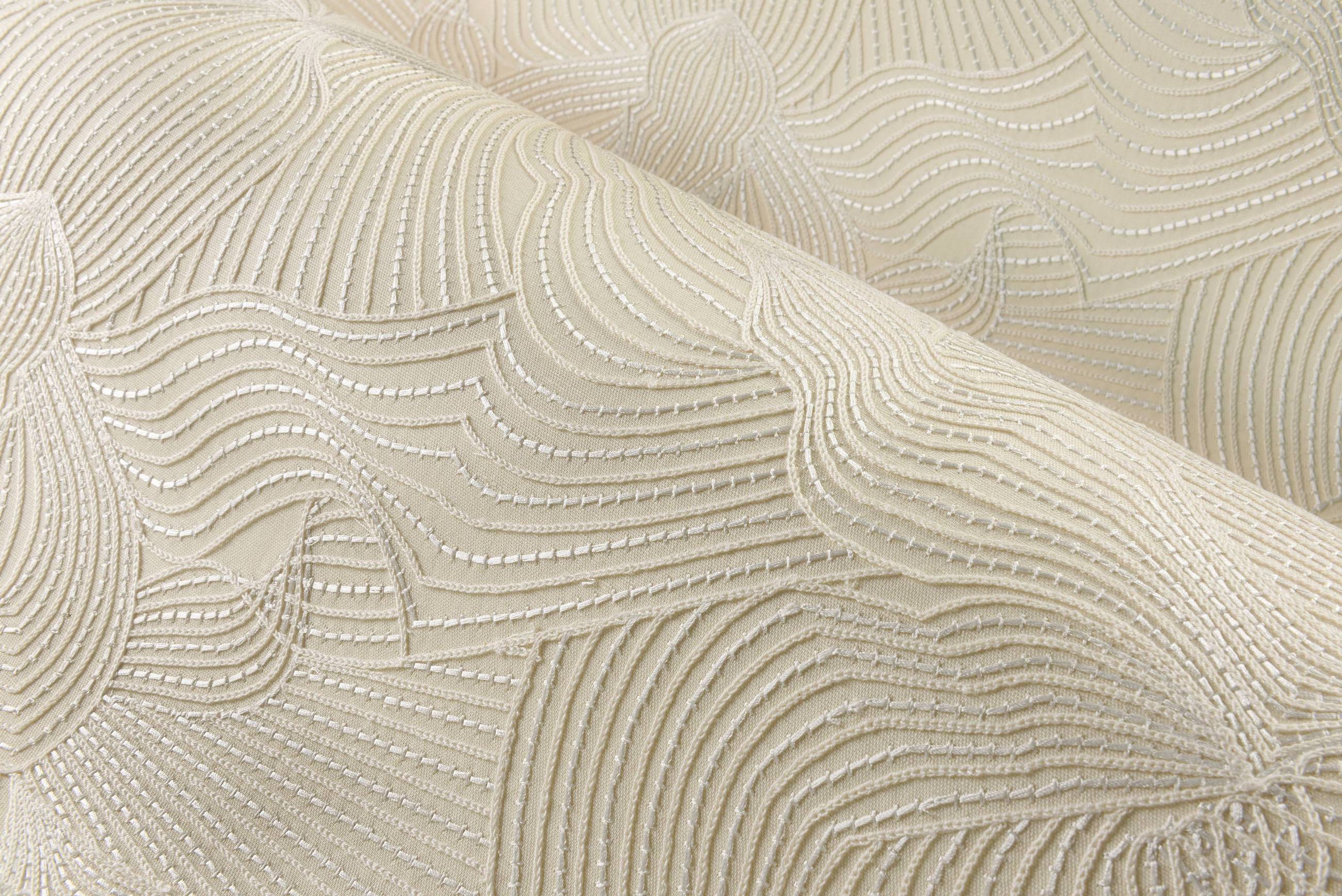 Текстильное настенное покрытие с характерным муаровым эффектом, созданным с помощью стежкового рисунка, когда узор вышивается на ткани из смеси хлопка и льна.