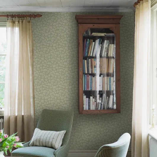 Восхитительные и стильные обои Hagtorn Serpentine, выполненные в стиле гобеленового рисунка боярышника, были впервые напечатаны в 1920-х годах. Они выполнены в нежных зеленых тонах и имитирует текстиль и придает помещению более нарядный вид.