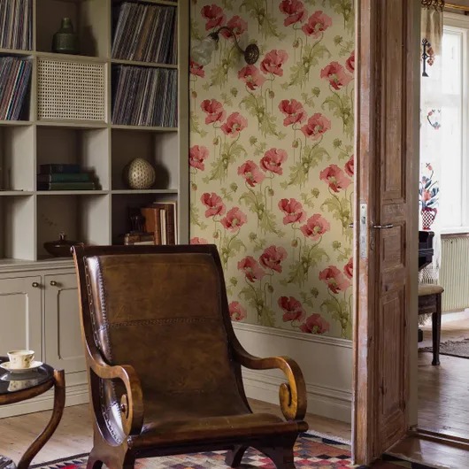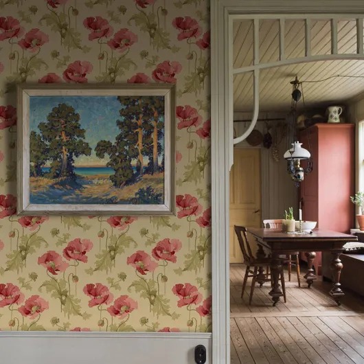 На обоях от Vallmo Ingeborg изображены классические красные маки и зеленые листья на мягком бежевом фоне с оттенками охры. Обои, первоначально напечатанные в аналогичной палитре на рубеже 20-го века, придают помещениям теплоту благодаря плавным деталям в стиле ар-нуво, выполненным в насыщенных тонах. Печать на поверхности придает каждому рулону обоев неповторимый характер. Поклейте наши любимые обои Vallmo Ingeborg, чтобы придать вашему пространству глубину и гостеприимный шарм.