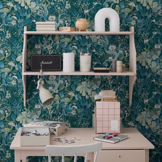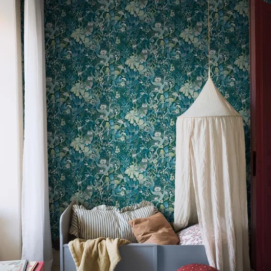 На обоях Magic Woods Moon Shadow/Сказочный лес изображен мистический лесной пейзаж. Обои выполнены в сине-зеленых тонах на темно-синем фоне и украшены акварельным рисунком лесной фауны, выглядывающей из-за извилистых ветвей, и мистическими грибами. Поклейте вместе с вашим малышом эти мистические обои в детской комнате, чтобы создать очаровательный мир с игривыми деталями.