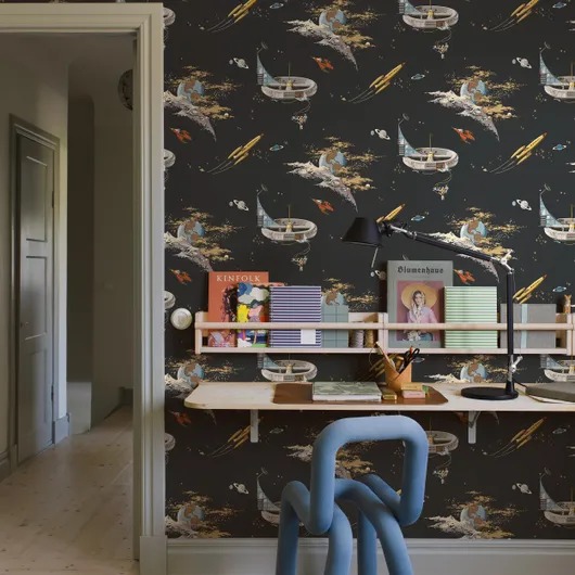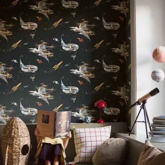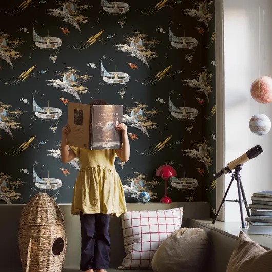 Превратите стены в космическое путешествие с помощью наших обоев Space Adventure Volcanique/ Космические приключения в разноцветных тонах на теплом черном фоне. Яркие космические корабли, астронавты и планеты плавают среди золотых звезд и мерцающей звездной пыли в этом винтажном дизайне. Создайте смелый, творческий фон в детской комнате.
