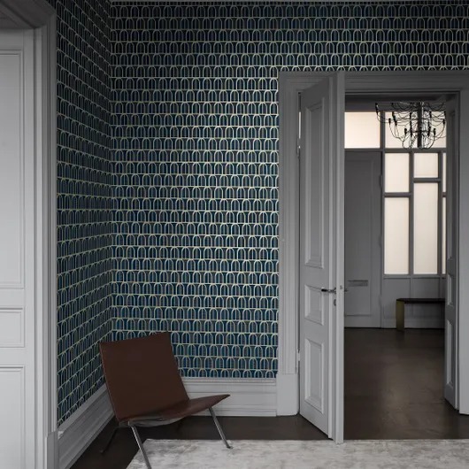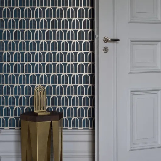 Venice - это стильные, выразительные шведские обои, вдохновленные ставнями на фасадах многих красивых зданий Венеции. Графичный, ритмичный узор, которому придает дополнительную жизнь мерцающий золотой принт. Элегантность 1970-х годов по-новому! Изысканная Венеция доступна в трех цветах. Здесь вы видите обои с арками из бронзового золота на матовом фоне нежно-голубого и темно-синего цветов.
