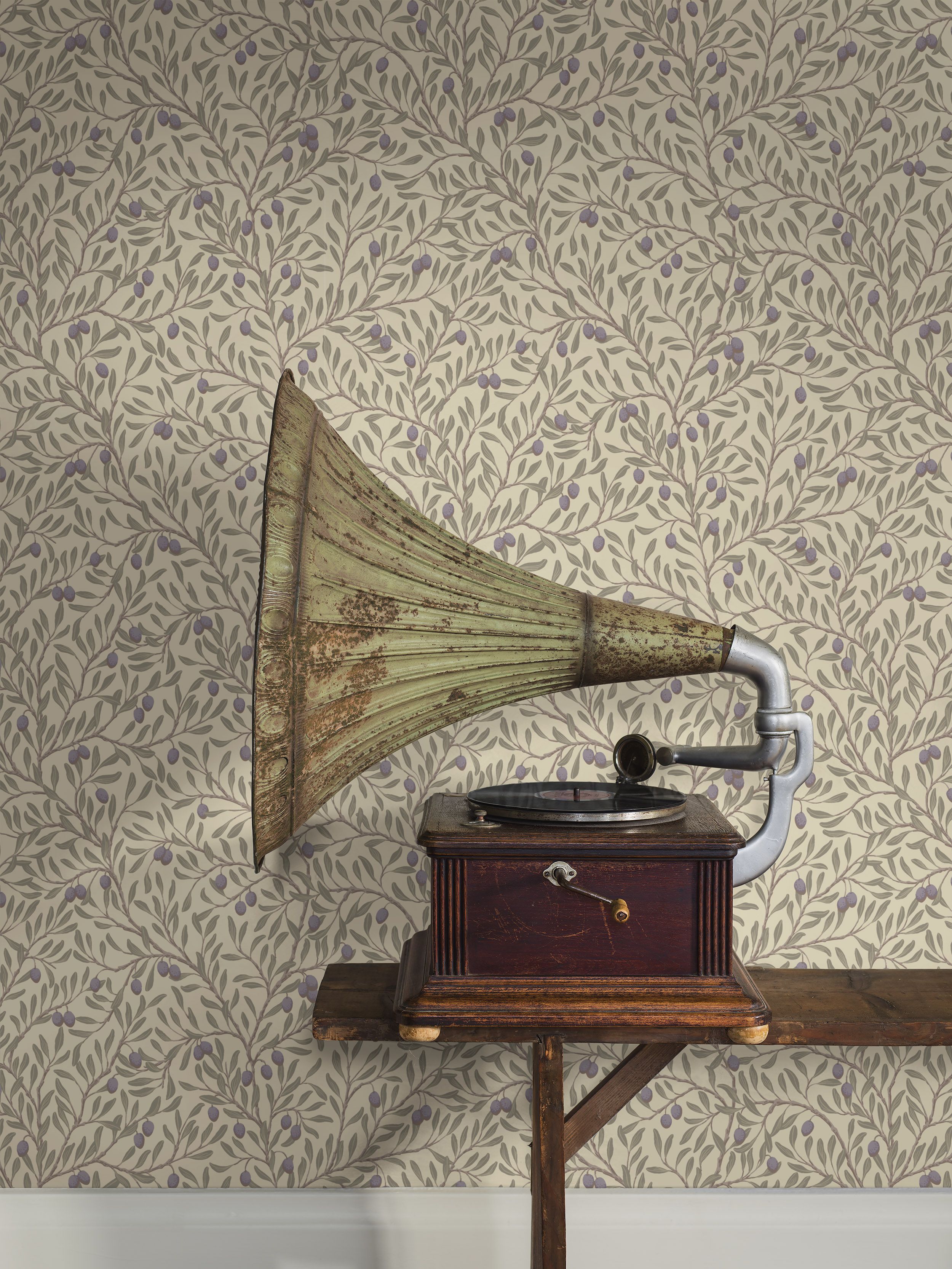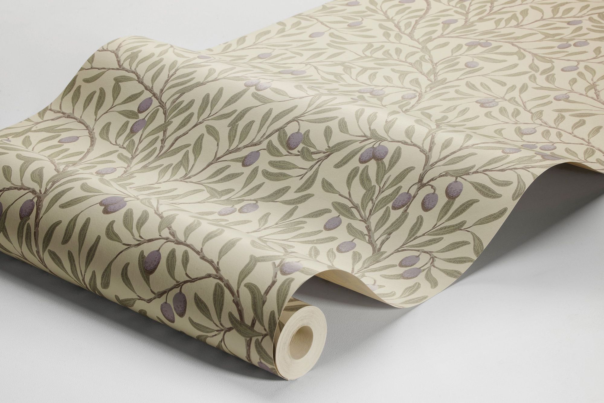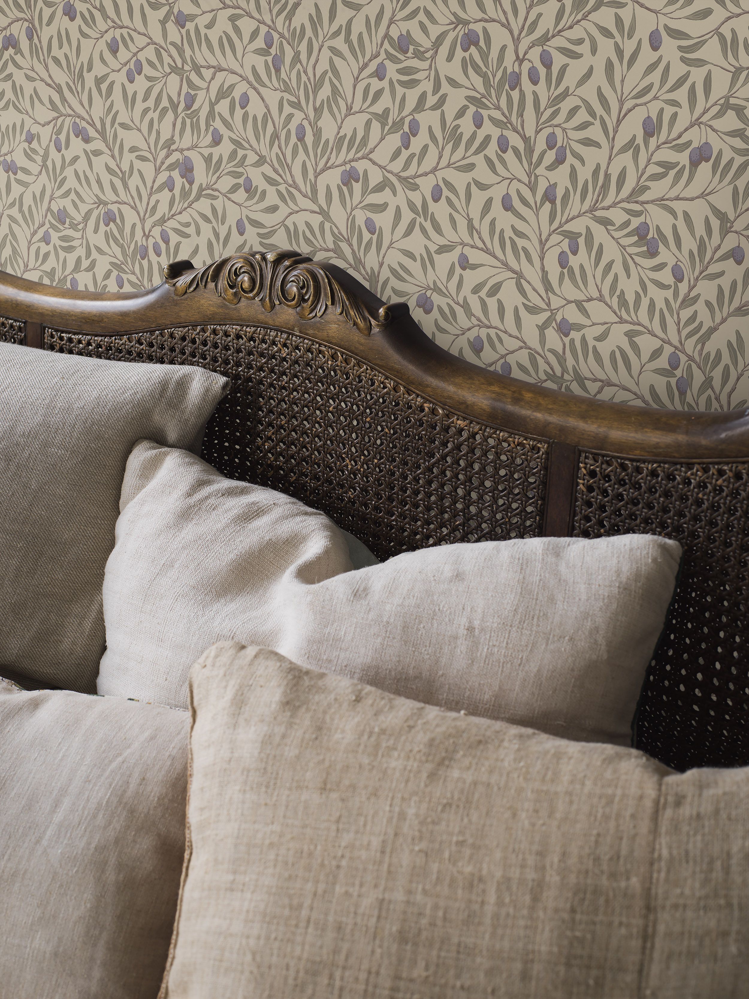 Великолепные оливковые деревья с зелеными листьями и сине-фиолетовыми маслинами на коричнево-бежевых ветках на светлом, слегка желто-зеленом фоне. Узор напечатан традиционным методом высокой печати, чтобы придать ему тактильность, теплоту и уют. для придания тактильности, теплоты и уюта узору.
