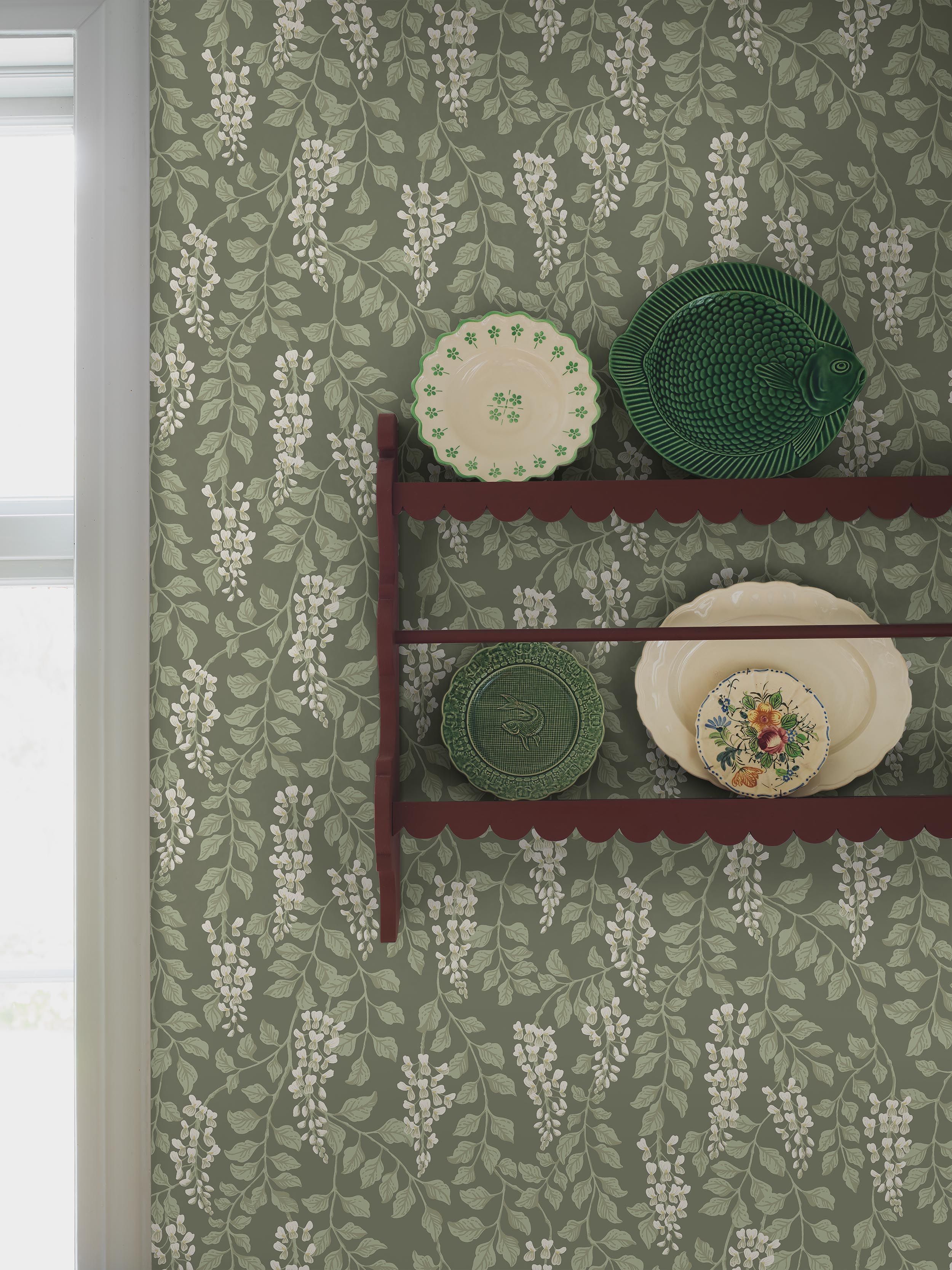 Глициния - это яркие цветочные обои с ручным акварельным рисунком, изображающим прекрасные гроздья цветов и извилистую листву глицинии. Нежный, воздушный узор придает комнате спокойную, но богатую и уютную атмосферу.