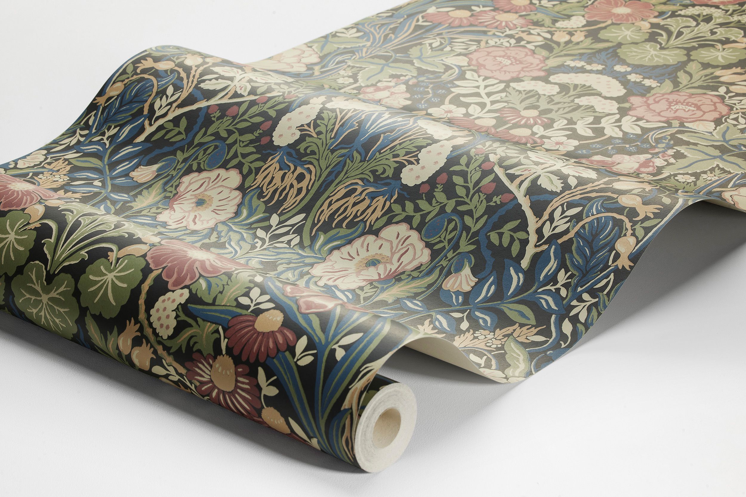 Чудесные замысловатые обои Örtagård выполнены в яркой, но уютной палитре с приглушенными светло-розовыми, вишневыми, лазурными и персиковыми цветами на фоне свежей зеленой листвы с оттенками желтого на матовом, почти черном фоне. Плотный рисунок в стиле творчества прерафаэлитов, выполненный традиционной техникой поверхностной печати, придаст объемный и тактильный эффект стенам в гостиной, прихожей, спальне или на кухне и, безусловно, не оставит вас и ваших гостей равнодушными.