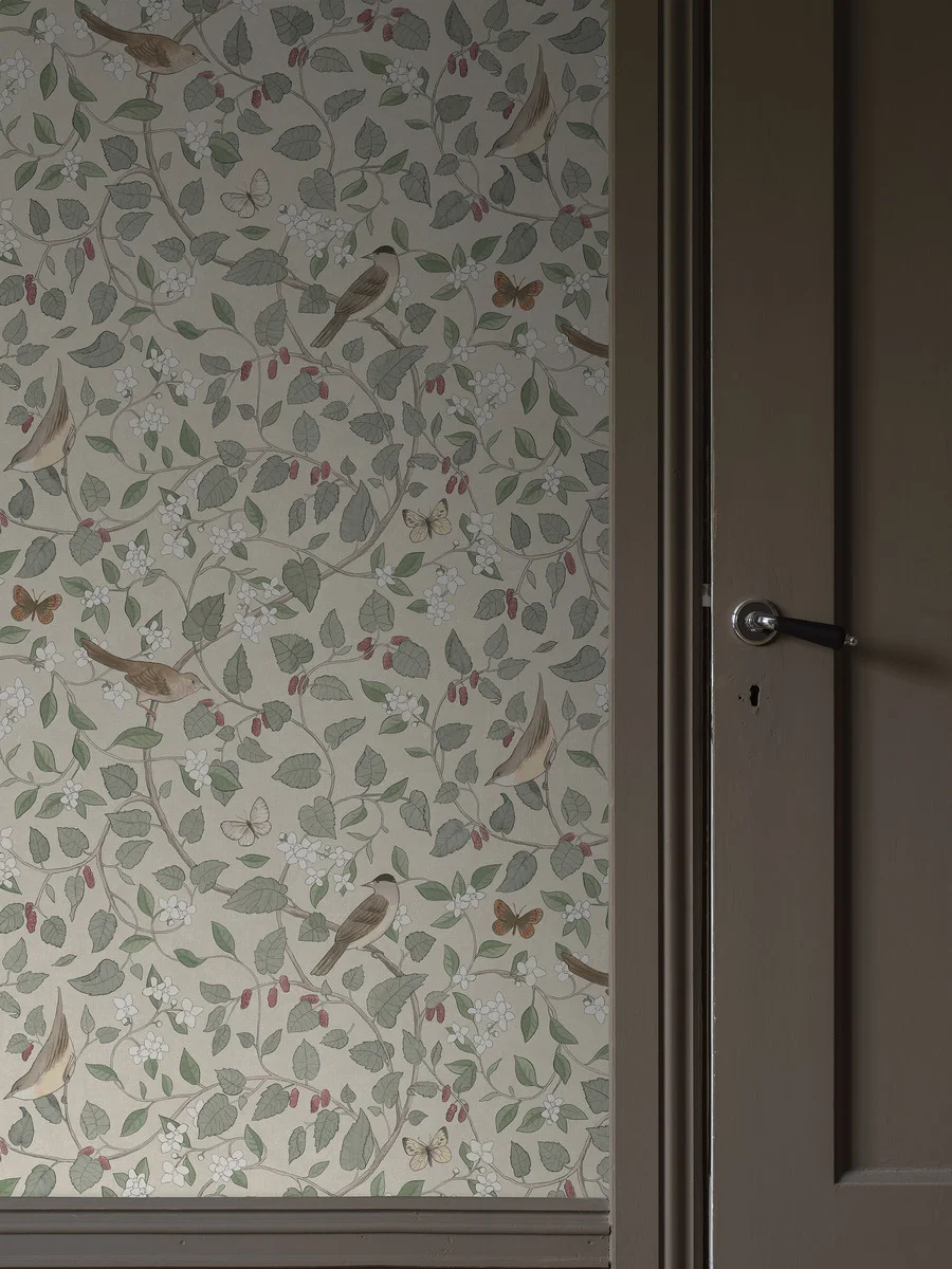 Наши обои Sångfåglar, выполненные в приглушённых оттенках бежевого, зелёного, белого, коричневого и жёлтого с нотками красного, выглядят сдержанно, но при этом романтично и стильно. На этой гармоничной бумаге, нарисованной акварелью и мелом, среди ветвей тутового дерева и цветов чубушника изображены скромные, но красивые певчие птицы и бабочки.