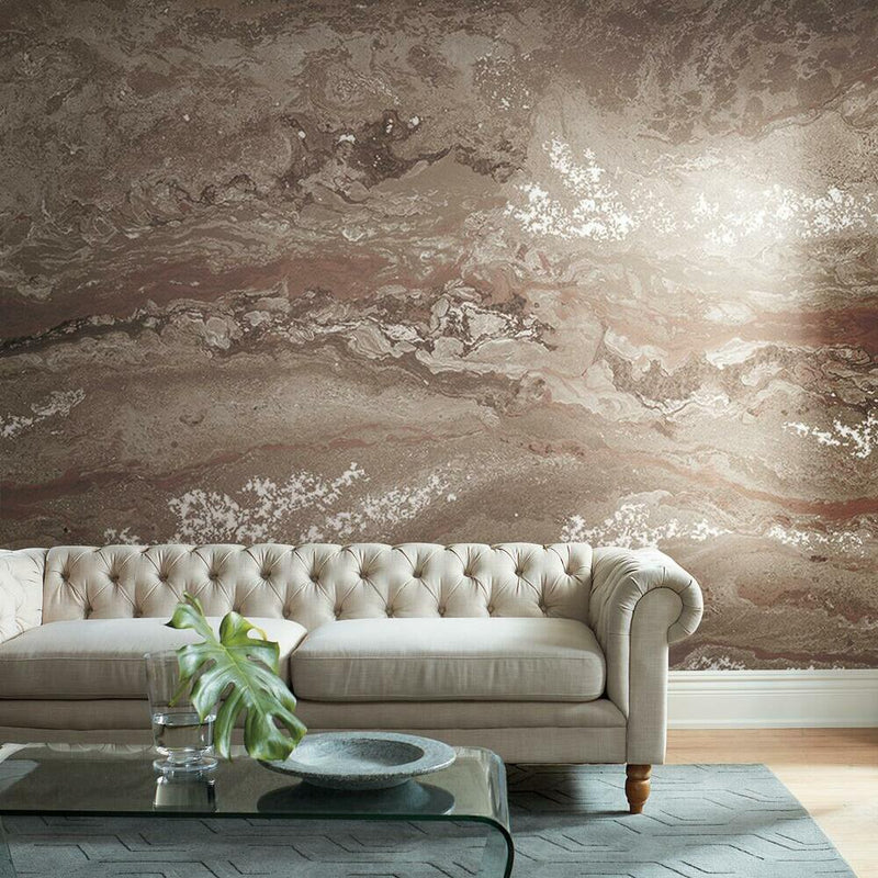 Эта настенная роспись, выполненная цифровой печатью на светоотражающей слюде, отражает сущность земли, камня, воды и воздуха. Художественное исследование широких возможностей создает естественный узор свободной формы.