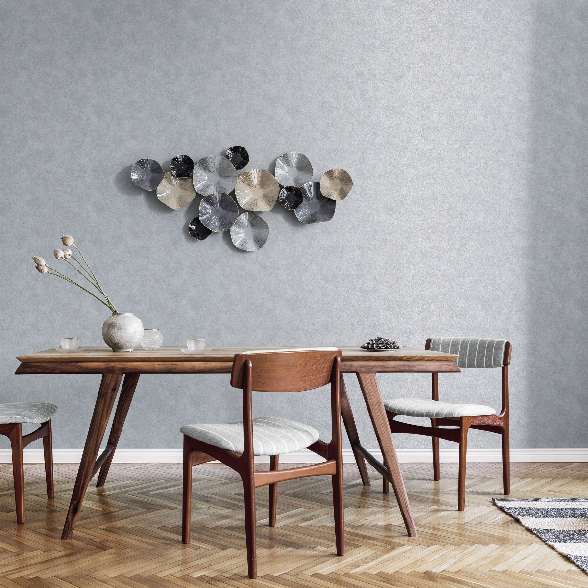 Обои с текстурой изящных металлизированных эффектов. Современная цветовая палитра подчеркивает эффектность дизайна.