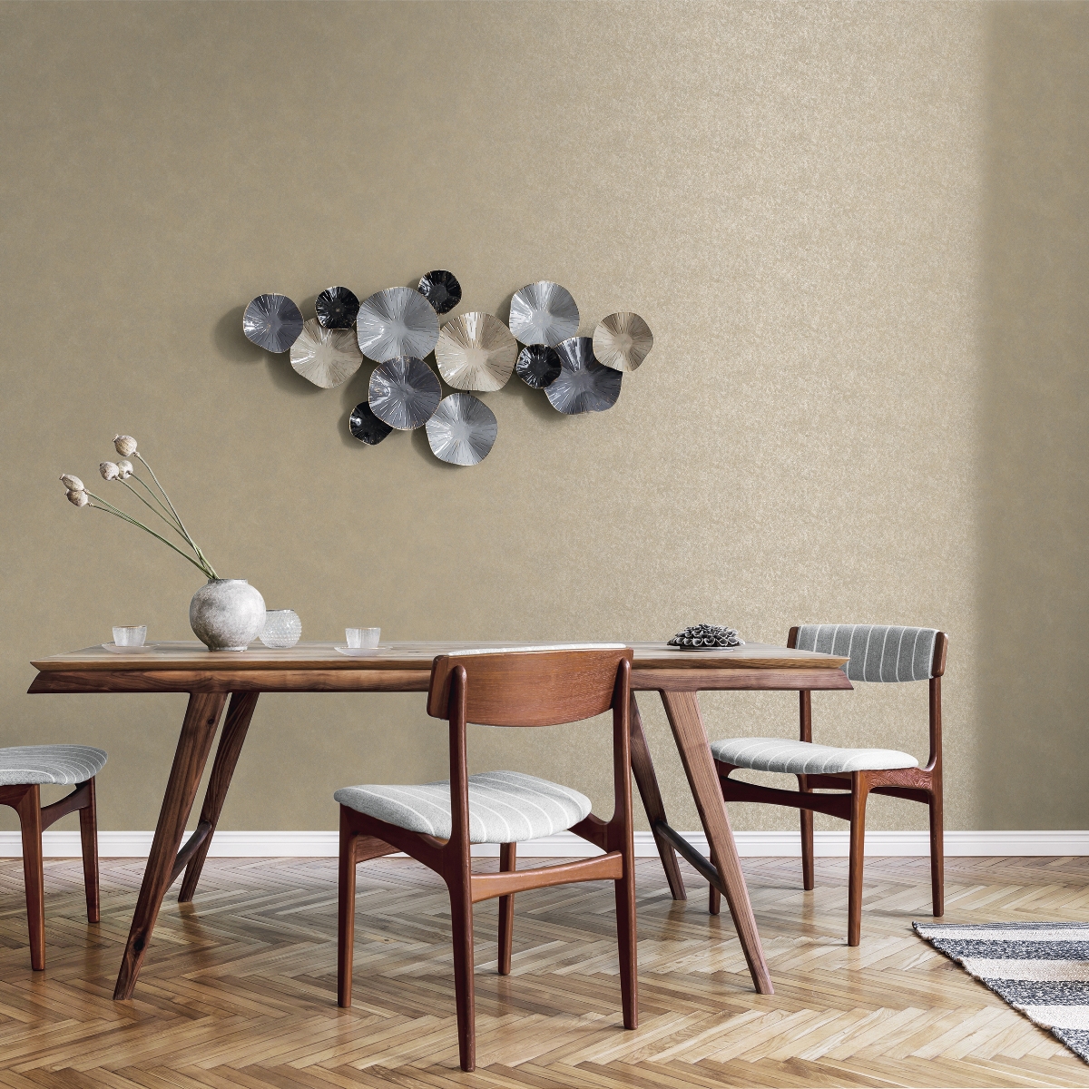 Обои с текстурой изящных металлизированных эффектов. Современная цветовая палитра подчеркивает эффектность дизайна.