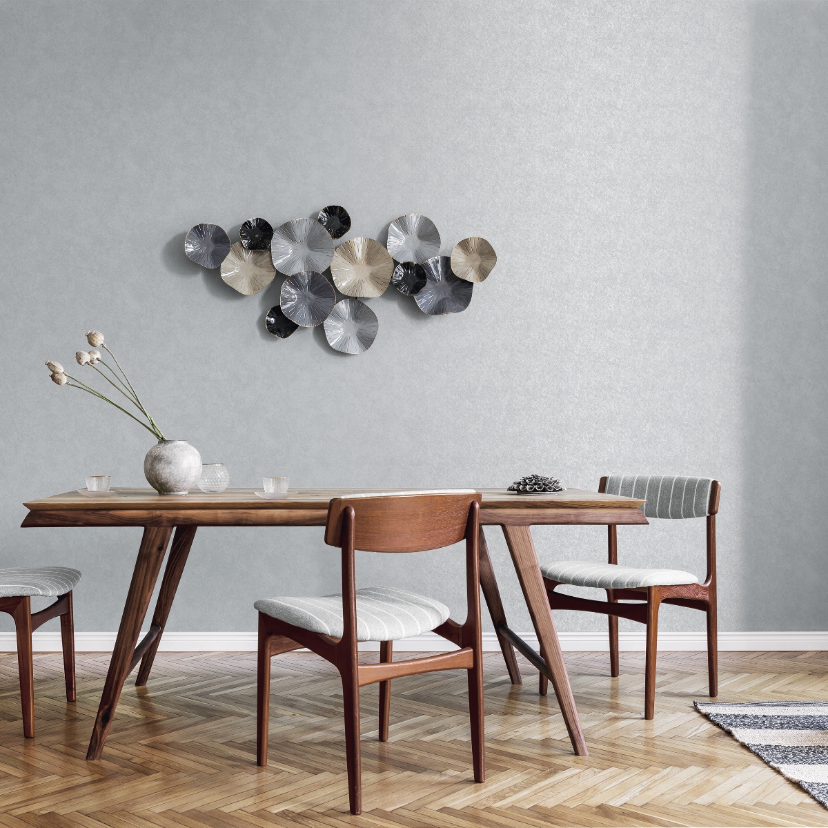 Обои с текстурой изящных металлизированных эффектов. Современная цветовая палитра подчеркивает эффектность дизайна.