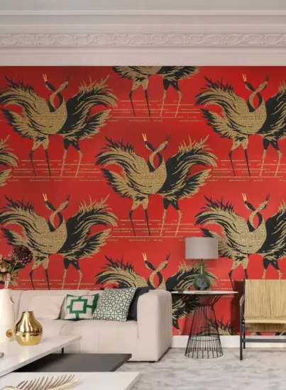 На обоях изображены две изящно переплетающиеся цапли на мерцающем металлическом фоне. Узор сочетает в себе элегантную японскую эстетику с естественностью и добавляет особый акцент в комнату благодаря блестящим рельефным бусинам золотого или серебряного цвета. Роскошная поверхность в сочетании с азиатским дизайном создает гармоничный эффект на стене с оттенком экзотики.